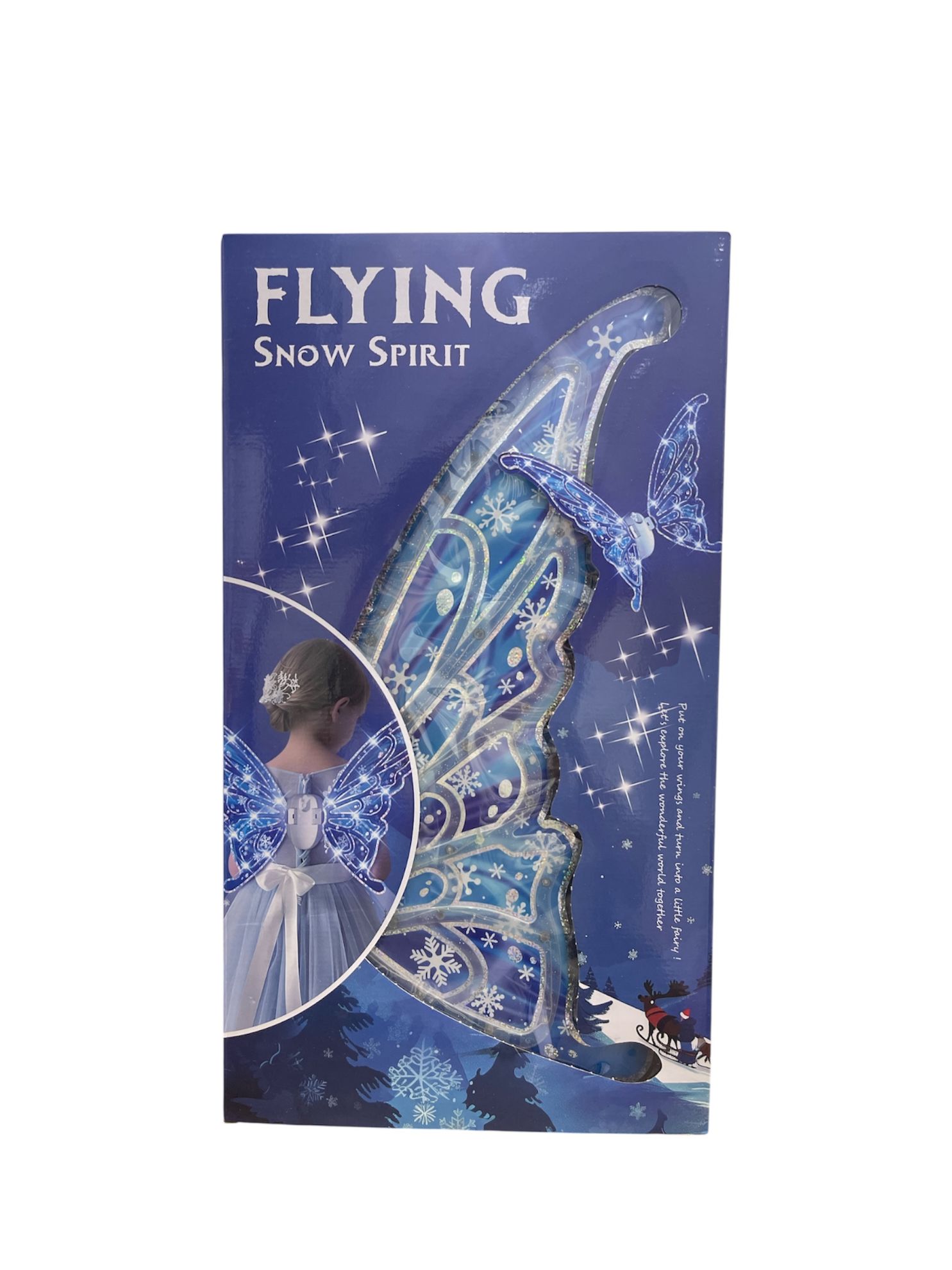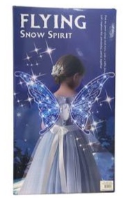 المنتج: عبارة عن أجنحة خيالية مصممة للأطفال، مستوحاة من فكرة "روح الثلج".  المظهر: تتميز الأجنحة بتصميم يشبه أجنحة الفراشة أو الجنيات، مزينة بزخارف لامعة ونقوش تشبه ندف الثلج، مما يعطيها مظهرًا سحريًا وبرّاقًا.  الهدف: تهدف إلى تحويل