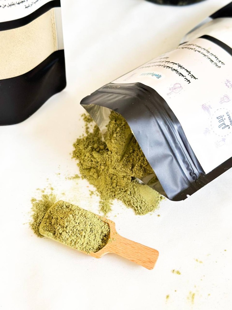 تحتوي على مجموعة كبيرة ومتنوعة من الأعشاب المفيدة للشعر منها أعشاب هندية ومنها صينية لكل عشبة خصائص وفوائد صحية للشعر تضاف بنسب مدروسة وموزونة ويحتوي أيضاً على عشبة السدر المعروفة بفوائدها للشعر. الطريقة/ ممكن عجنها بمغلي البصل والثوم والشاي الأسود وممكن إضافة زبادي أو موزة مستوية .. أو عجنها بقليل من ماسك الباروكة لنتيجة أقوى .. ( العجن حسب الرغبة).