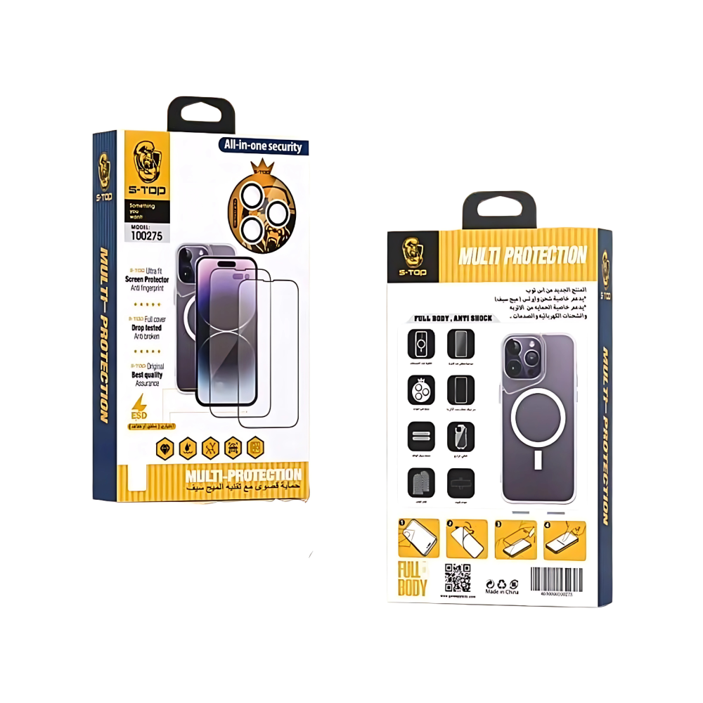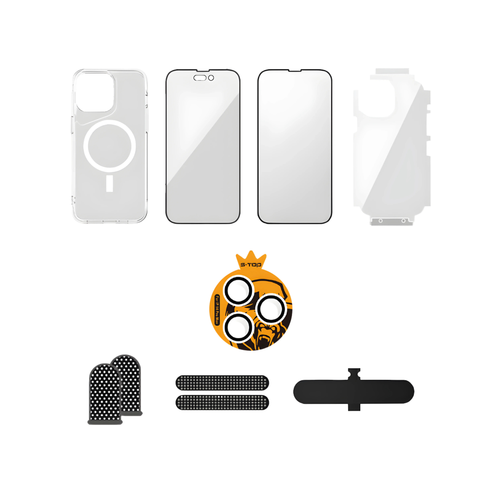 ومصمم بشكل خاص لسلسلة هواتف iPhone 15 البكج يوفر حماية شاملة للجهاز، ويشمل عادةً مجموعة من المكونات الأساسية مثل: كفر حماية ضد الصدمات. شاشة حماية أمامية (شفافة ومطفية). حماية حرارية خلفية. حماية للكاميرا. أدوات التركيب. قفاز ألعاب.