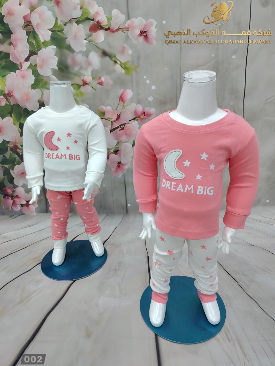 بيجامة بناتي مكوّنة من بلوزة طويلة الأكمام بطباعة قمر ونجوم مع عبارة DREAM BIG، وبنطال بنقشة نجوم متناسقة. خامة ناعمة ومريحة تمنح إحساس دافئ ومثالي للنوم الهادئ.