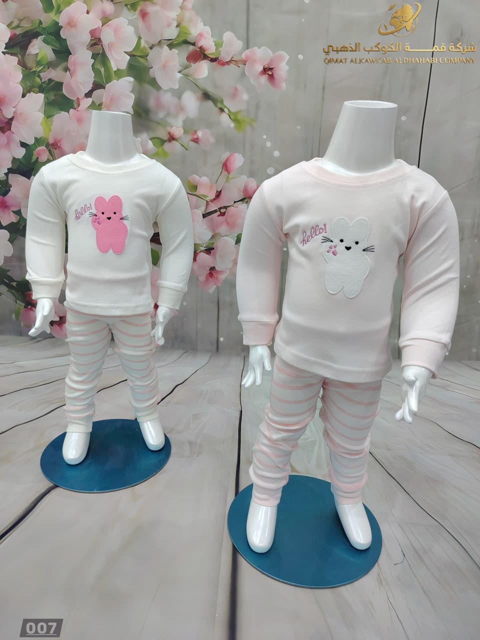 بيجامة بناتي ناعمة مكوّنة من بلوزة طويلة الأكمام بتطريز أرنب لطيف وكلمة hello!، مع بنطال مخطط بلون متناسق. خامة مريحة ودافئة تمنح الأطفال إطلالة هادئة ومثالية للنوم.