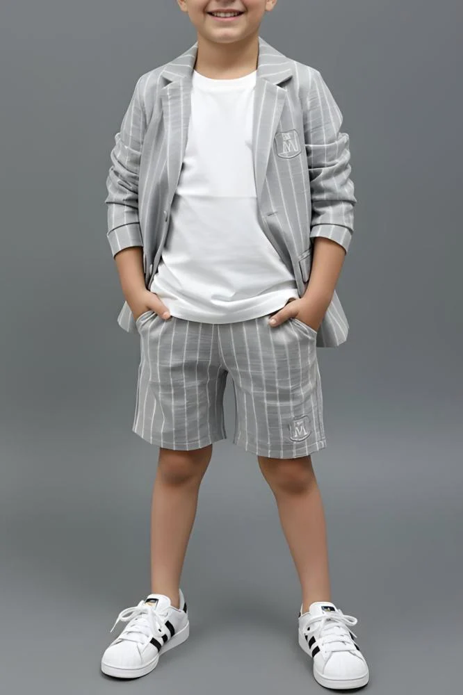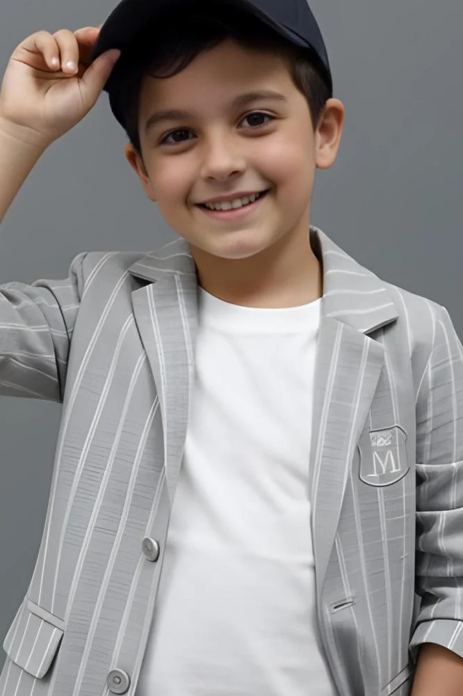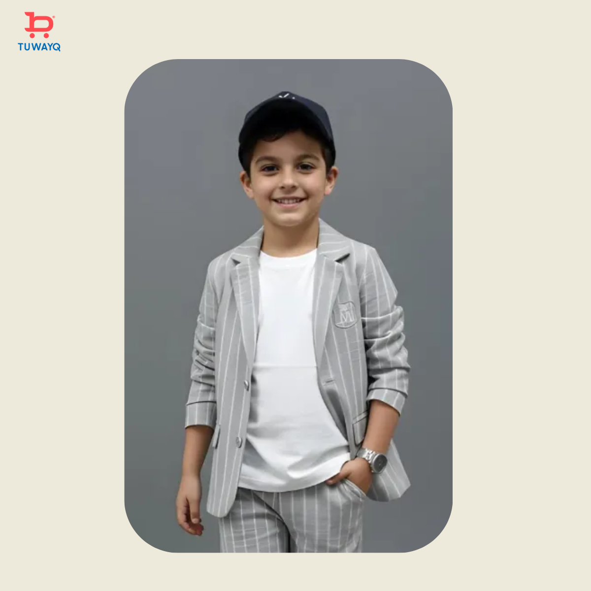 امنح طفلك إطلالة راقية ومليئة بالثقة مع هذا الجاكيت الرمادي المخطط الأنيق المصنوع بدقة عالية، والذي يأتي مع تيشيرت أبيض بسيط لإكمال المظهر العصري المثالي. تصميم يجمع بين الرقي والراحة، ليكون الخيار الأمثل للمناسبات الخاصة أو الإطلالات اليومية الراقية.