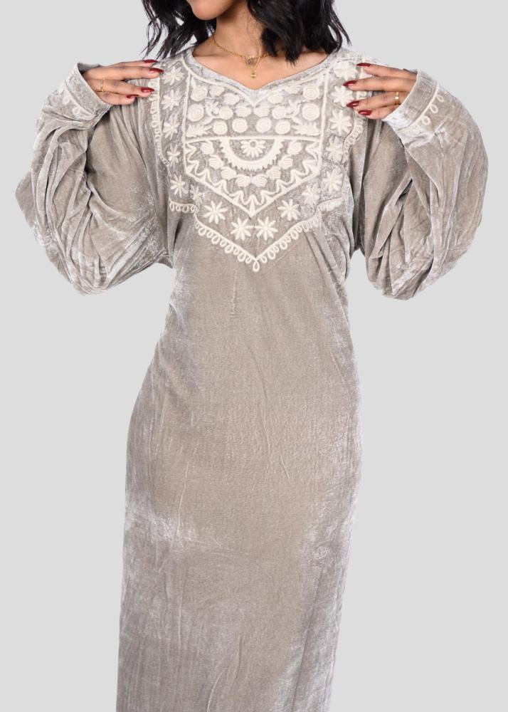 القماش الأساسي: مخمل عالي الكثافة بجودة عالية. الملمس: ناعم ودافئ ومناسب للطقس البارد. اللون: متوفر بـ 3 الوان مميزة التصميم: قصة ماكسي مستقيمة تحقق مظهرًا منظمًا وراحة أثناء الحركة. الزخرفة: تطريز فضي هندسي موزع على الصدر والأكمام. الرقبة: ياقة مربعة بتشطيب نظيف ومتقن. الأكمام: طويلة بفتحة مريحة تعزز سهولة اللبس. الاستخدام: مناسبة للمناسبات الرسمية والاجتماعات المنزلية الشتوية. يفضل اعتماد التنظيف الجاف للحفاظ على نعومة المخمل وثبات التطريز. عند الغسيل المنزلي، ينصح بالغسيل اليدوي بماء بارد ومنظف لطيف. تجفيف طبيعي بعيدًا عن أشعة الشمس المباشرة، ويمنع استخدام النشافة. الكي بدرجة منخفضة جدًا، ويفضل بالبخار ومن الجهة الخلفية مع استخدام قطعة قماش عازلة.