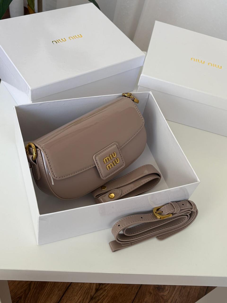 حقيبة Miu Miu بلون البيج اللامع هذه حقيبة كتف عصرية وأنيقة من دار Miu Miu. تتميز بلون البيج الفاتح واللامع، وتصميمها المدمج الذي يجعلها رفيقًا مثاليًا لإطلالاتك اليومية أو المسائية. الحقيبة مزودة بحزام كتف عريض وقصير لتلبس تحت الإبط، بالإضافة إلى حزام آخر أطول قابل للتعديل والفصل. يزينها شعار Miu Miu المعدني باللون الذهبي في المنتصف، مما يؤكد على جودتها وتصميمها الراقي.