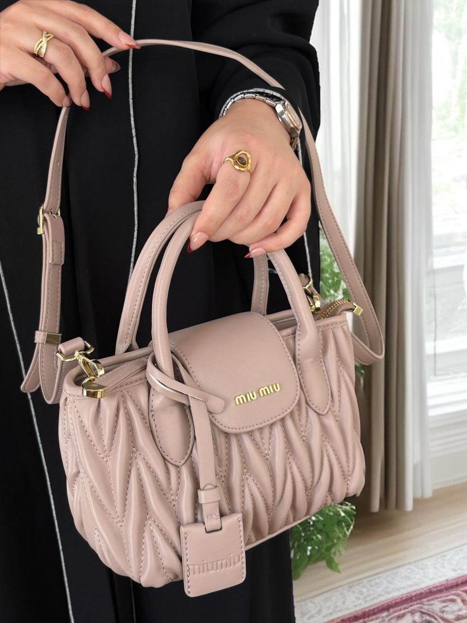 حقيبة يد Miu Miu بلون وردي فاتح، تتميز بتصميمها الأنثوي الأنيق. مصنوعة من جلد ناعم مزين بنمط Matelassé المبطّن، ولها مقبضان علويان وحزام كتف قابل للفصل. القطع المعدنية باللون الذهبي تكمل التصميم الفاخر، وشعار Miu Miu يزين الجهة الأمامية. هذه الحقيبة مناسبة للمناسبات الخاصة واليومية، وتضفي لمسة من الأناقة والجاذبية على إطلالتك.