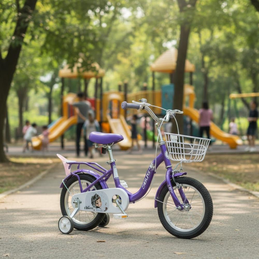 • دراجة بنات مقاس 14 إنش بتصميم عصري وأنيق باللون البنفسجي.