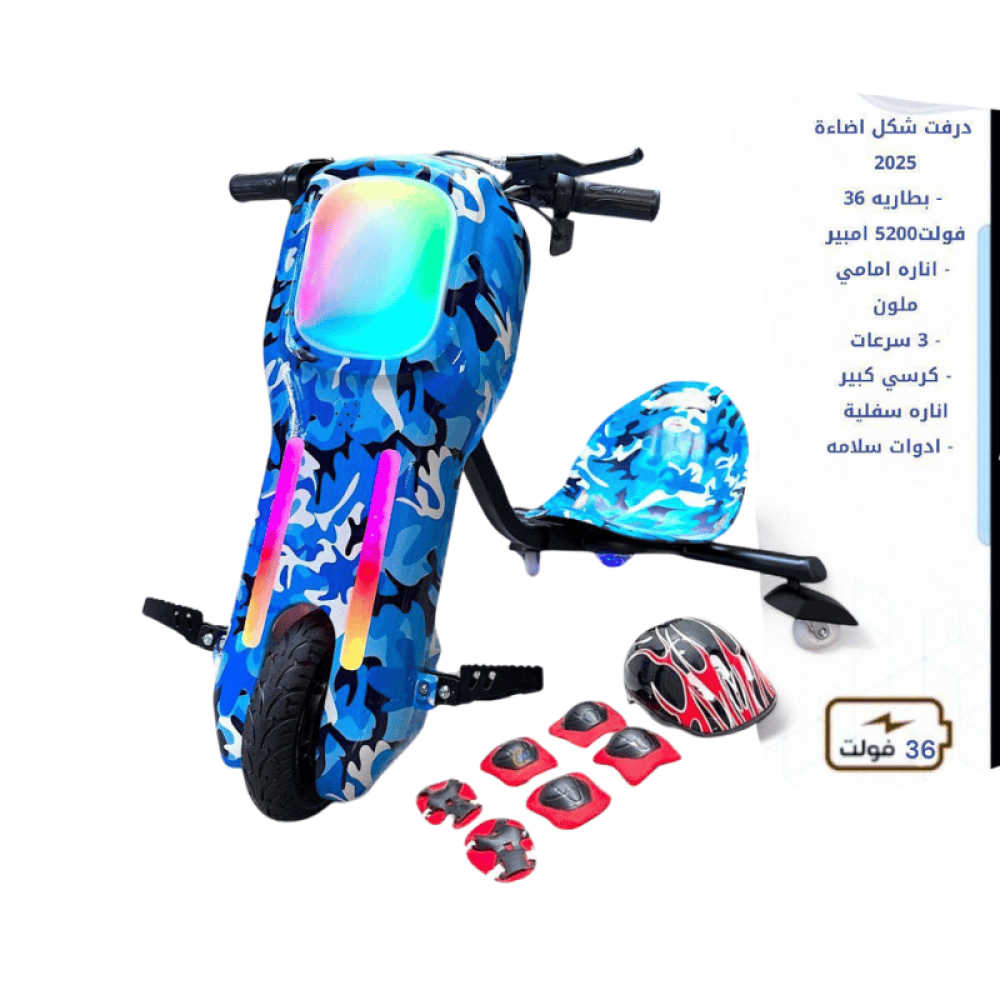استمتع بتجربة قيادة رائعة مع الدراجة الكهربائية بتصميم إضاءة مميز! تأتي هذه الدراجة مع بطارية 36 فولت 5200 أمبير، مما يضمن لك رحلة طويلة وسرعة تصل إلى 3 سرعات مختلفة. تصميمها العصري بألوان الكامو مع إضاءة ملونة تجعلها مميزة، بالإضافة إلى كراسي كبيرة وأنظمة أمان متكاملة.
