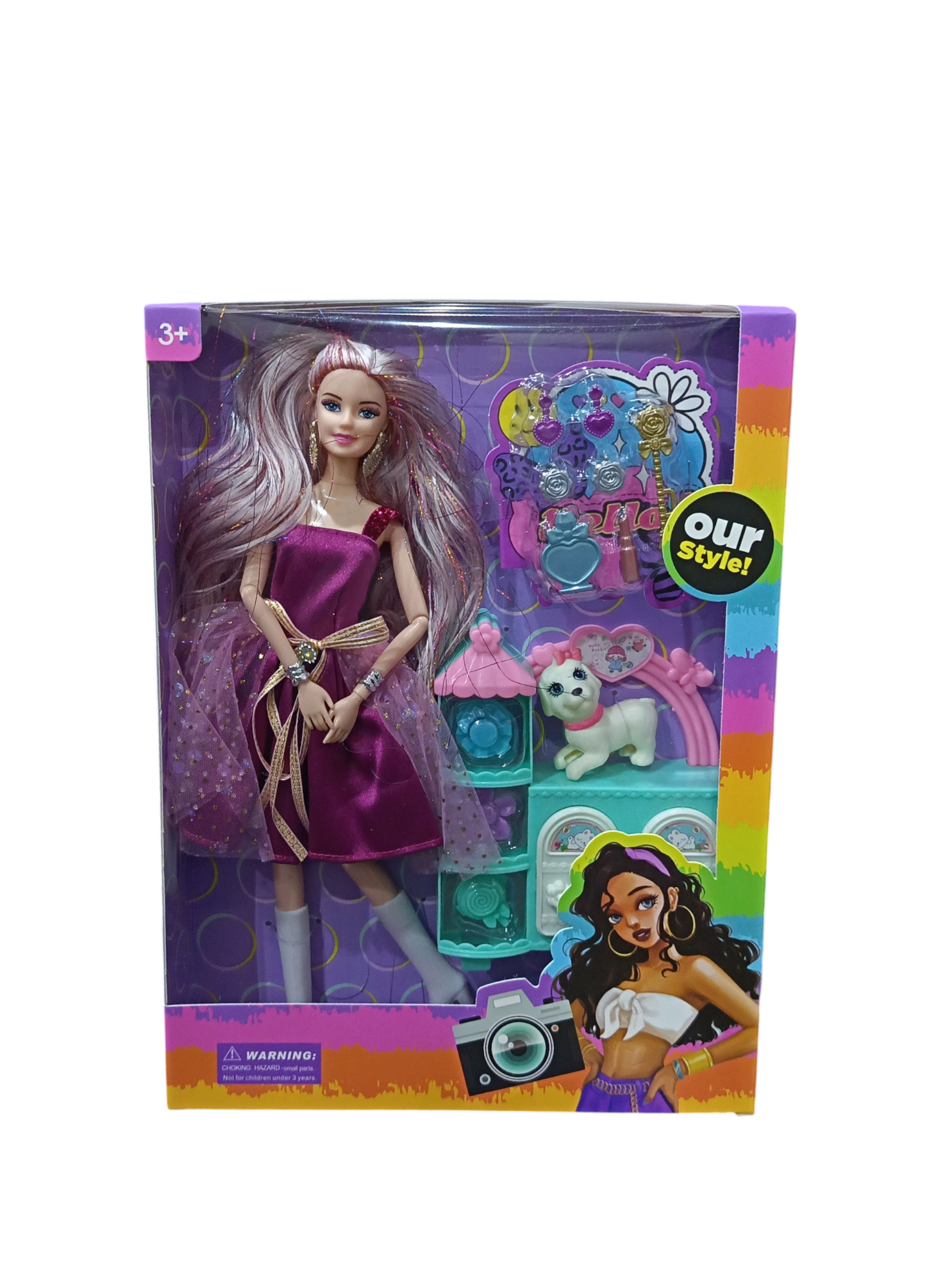 دمية أزياء مع إكسسوارات ومستلزمات حيوان أليف