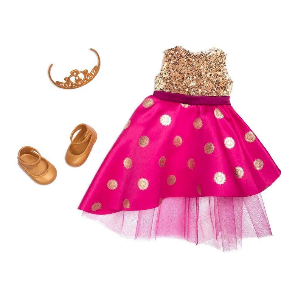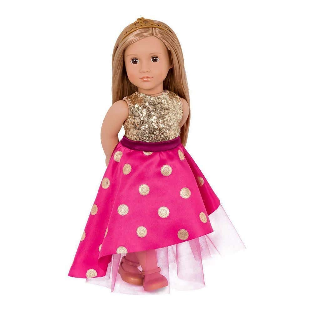 تتضمن العبوة الدمية، الفستان، التاج، الملابس الداخلية، والحذاء