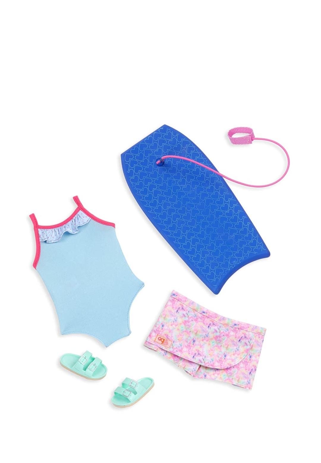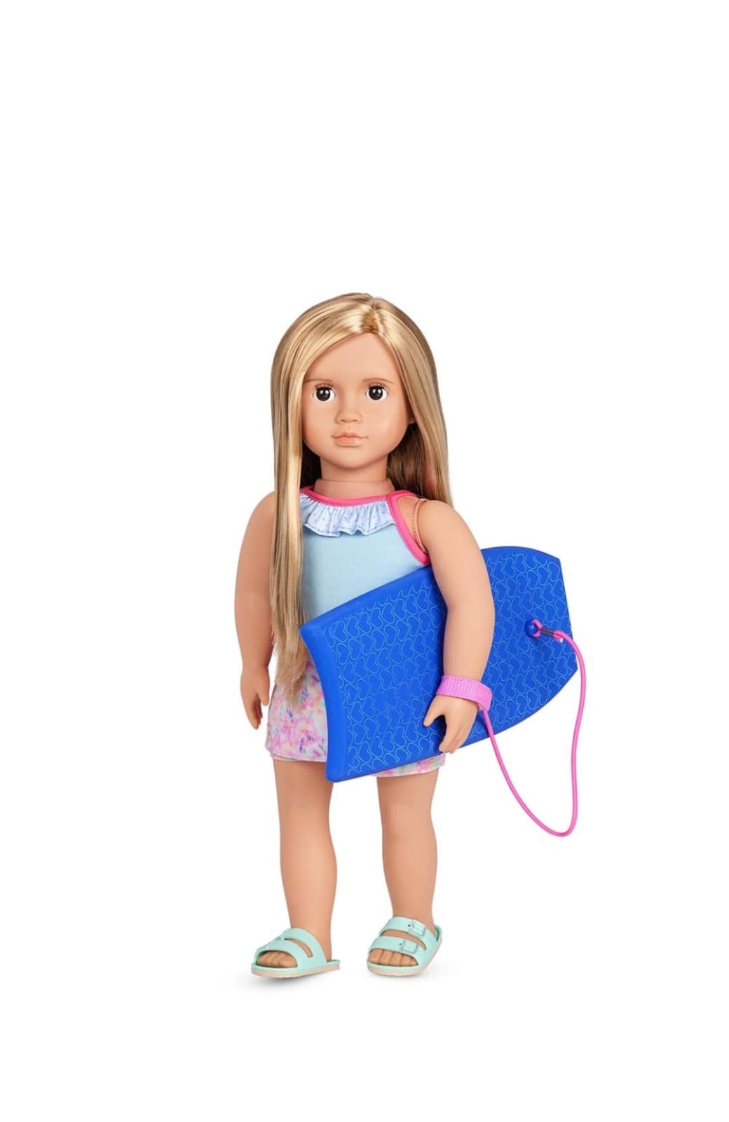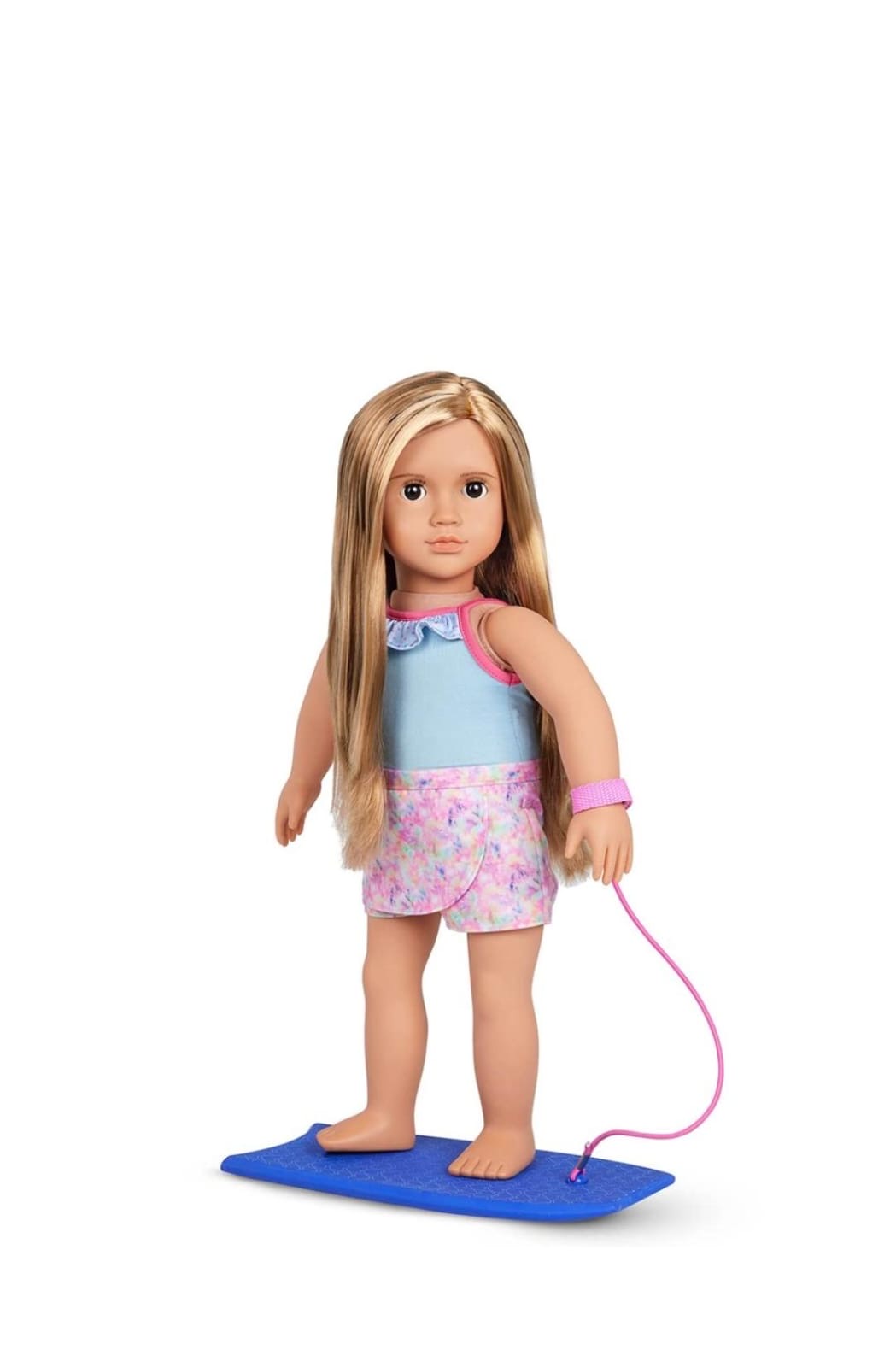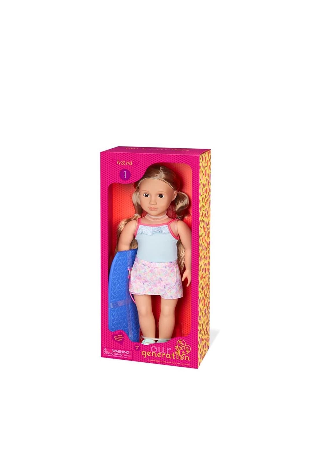 دمية إيفانا من أور جينيريشن - دمية شاطئ مقاس 18 بوصة مع لوح تزلج على الماء - تتضمن مجموعة ملابس شاطئ مكونة من 3 قطع