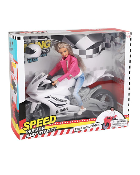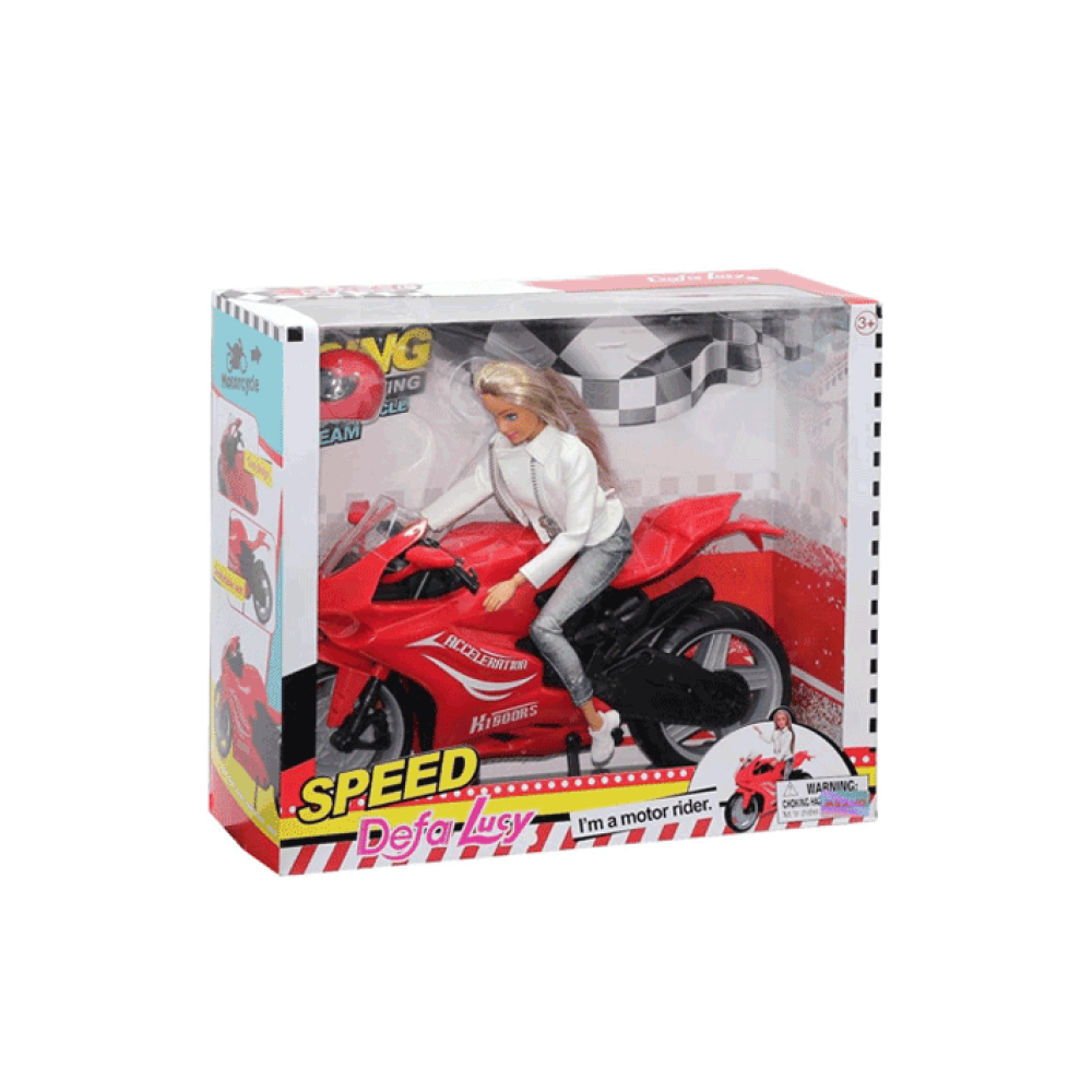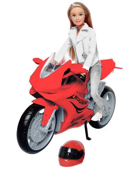 دمية مع دراجة نارية حمراء، مخصصة للأطفال بعمر 3 سنوات فما فوق. تجسد الدمية روح المغامرة والحرية، وهي جاهزة للانطلاق في رحلات مثيرة واستكشاف آفاق جديدة على دراجتها النارية الأنيقة