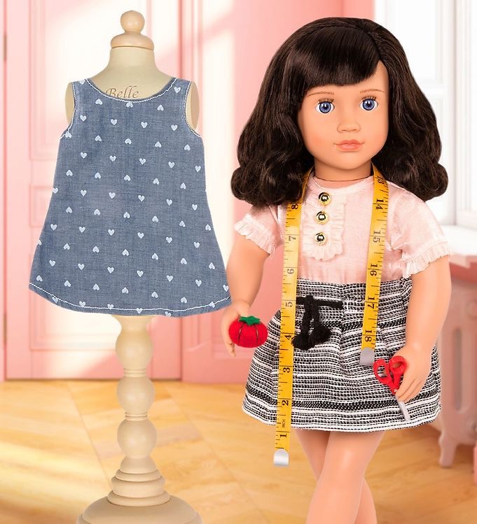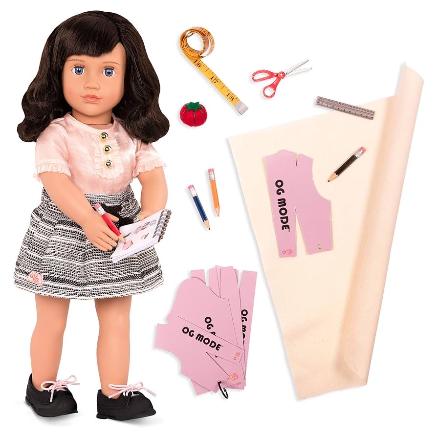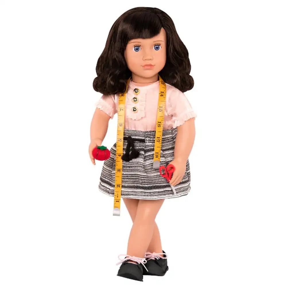 الدمية ترتدي زي مصممة أزياء وتأتي مع أدوات مثل شريط القياس ودبوس الطماطم والمقص، مما يعكس تخصصها في مجال تصميم الأزياء