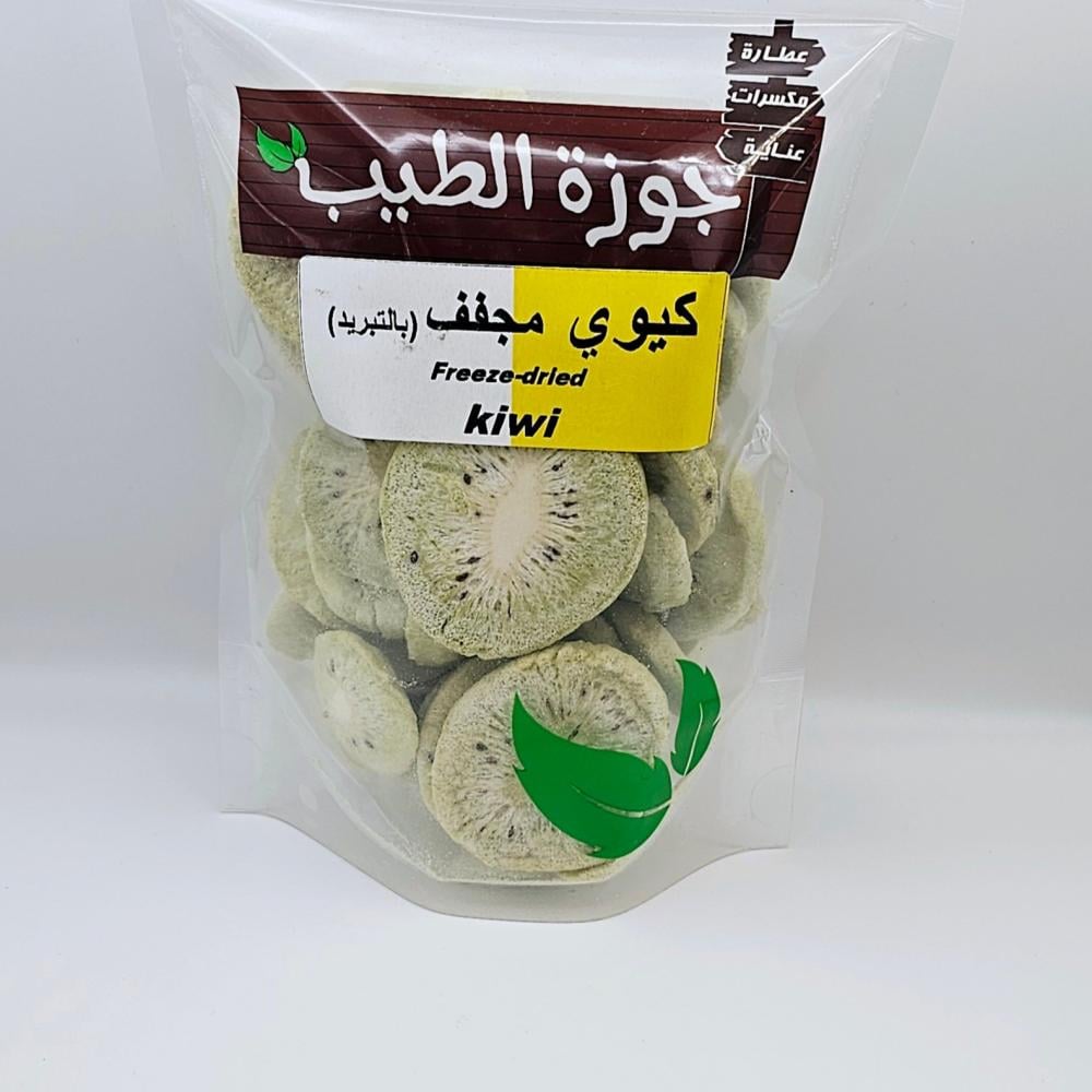 كيوي المجفف بالتجميد من جوزة الطيب : ( اضغط هنا لرؤية قسم الفواكة والخضروات المجففة )كيوي طازج تم تجفيفه باستخدام تقنية التجفيف بالتجميد (التجميد الفراغي). هذه العملية تحافظ على معظم خصائص الفاكهة الأصلية، مما يجعله وجبة خفيفة صحية ومغذية.إليك وصف تفصيلي للكيوي المجفف بالتجميد:المظهر والقوامالشكل: يحتفظ الكيوي المجفف بالتجميد بشكله الأصلي كشرائح أو قطع، مع ظهور بعض المسام فيه نتيجة إزالة الماء.اللون: يحافظ على لونه الأخضر الزاهي المميز للكيوي الطازج، وقد يكون هناك تباين طفيف في اللون حسب درجة النضج الأصلية للفاكهة.القوام: يتميز بقوام هش ومقرمش وخفيف جداً، على عكس الفواكه المجففة بالطرق التقليدية التي تكون أكثر مطاطية أو لزوجة. يذوب في الفم بسهولة.النكهة والرائحةالنكهة: يحتفظ بنكهة الكيوي الأصلية، التي تمزج بين الحلاوة والحموضة المنعشة واللاذعة. نظرًا لإزالة الماء، تكون النكهة أكثر تركيزًا ووضوحًا من الكيوي الطازج.الرائحة: يحتفظ برائحة الكيوي العطرية المميزة.القيمة الغذائية والفوائدالحفاظ على العناصر الغذائية: تعد تقنية التجفيف بالتجميد من أفضل الطرق للحفاظ على القيمة الغذائية للفاكهة، حيث تحتفظ بـ 97% من العناصر الغذائية الموجودة في الكيوي الطازج، بما في ذلك الفيتامينات والمعادن ومضادات الأكسدة.غني بالفيتامينات والمعادن: يعتبر مصدرًا ممتازًا لفيتامين C (أكثر من البرتقال)، وفيتامين K، وفيتامين A، وفيتامين E، والبوتاسيوم، والألياف.بدون إضافات: عادة ما يكون خاليًا من السكر المضاف أو المواد الحافظة أو الألوان الاصطناعية، مما يجعله خيارًا طبيعيًا وصحيًا 100%.فوائد صحية: يساهم في دعم الجهاز الهضمي بفضل الألياف، ويعزز المناعة لاحتوائه على فيتامين C ومضادات الأكسدة، وقد يساعد في صحة القلب.مدة الصلاحية: يتمتع بفترة صلاحية طويلة جدًا عند تخزينه بشكل صحيح في مكان بارد وجاف وبعيدًا عن الرطوبة وأشعة الشمس المباشرة.الاستخداماتيمكن تناول الكيوي المجفف بالتجميد كوجبة خفيفة صحية بحد ذاتها، أو إضافته إلى:حبوب الإفطار والجرانولا.الزبادي والحلويات.العصائر والمشروبات.خلطات المكسرات والفواكه المجففة (Trail Mix).في الخبز والوصفات الحلوة كبديل للفواكه الطازجة.بشكل عام، الكيوي المجفف بالتجميد هو طريقة ممتازة للاستمتاع بفوائد الكيوي ونكهته المركزة وقوامه المقرمش على مدار العام، وهو خيار مثالي لمن يبحثون عن وجبات خفيفة صحية ومغذية.