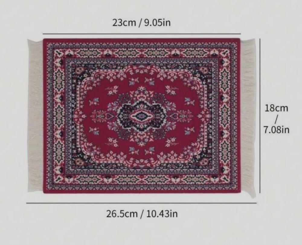 سجادة مصغرة مصممة لوضع إبريق الشاي والأكواب والكاسات.* الميزات الرئيسية• تصميم تقليدي فاخر: تتميز السجادة بنمط تقليدي مستوحى من السجاد الشرقي، مع تفاصيل معقدة وألوان أبرزها اللون الأحمر الداكن مع نقوش باللون العاجي والكحلي والأزرق الداكن.• خامات عالية الجودة: مصنوعة من نسيج متين يشبه ملمس السجاد الحقيقي.• حواف مزركشة (شراشيب): تحتوي على شراشيب فاتحة اللون على الأطراف القصيرة، مما يضفي عليها مظهرًا أصيلاً.• قياسات مثالية للاستخدام: الأبعاد موضحة على الصورة، وهي مناسبة كقاعدة تحت مقتنيات صغيرة أو كديكور:• العرض التقريبي (الجزء المنقوش): 18 سم.• الطول الكلي (مع الشراشيب): 26.5 سم.📌 الاستخدامات المقترحة• قاعدة تقديم الشاي: مثالية لوضع إبريق شاي صغير وعدد قليل من كاسات أو أكواب الشاي.• ديكور مصغر: يمكن استخدامها كعنصر ديكوري مميز على الرفوف، طاولات القهوة، أو ديكور المنازل.• قاعدة لإكسسوارات المطبخ: تصلح لوضع مطحنة القهوة، أو إناء صغير للبهارات، أو أي أدوات مطبخ صغيرة أخرى.