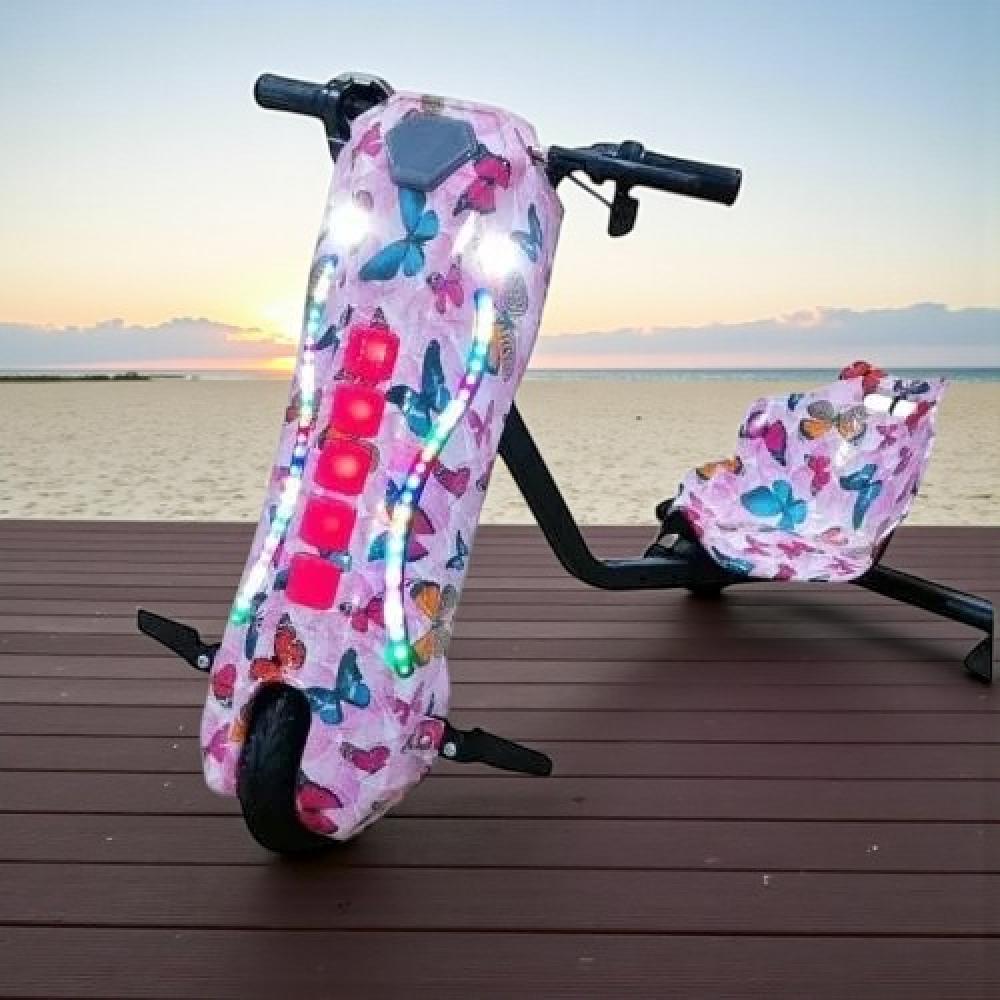 • سكوتر كهربائي مميز للأطفال بتصميم رائع وألوان زاهية مع رسومات الفراشات الجميلة .