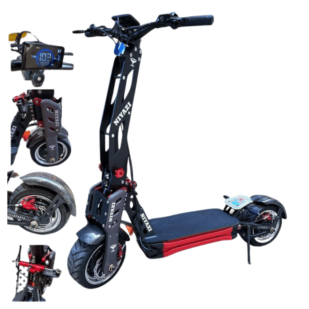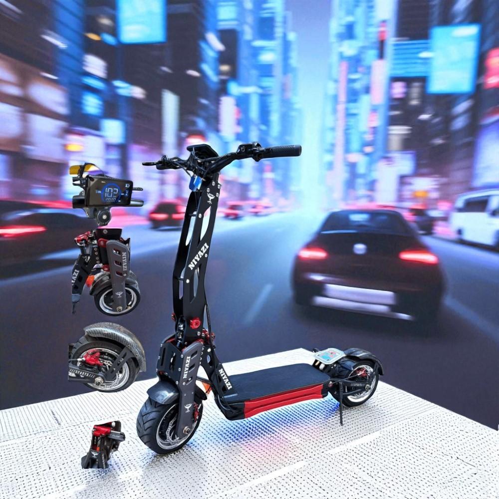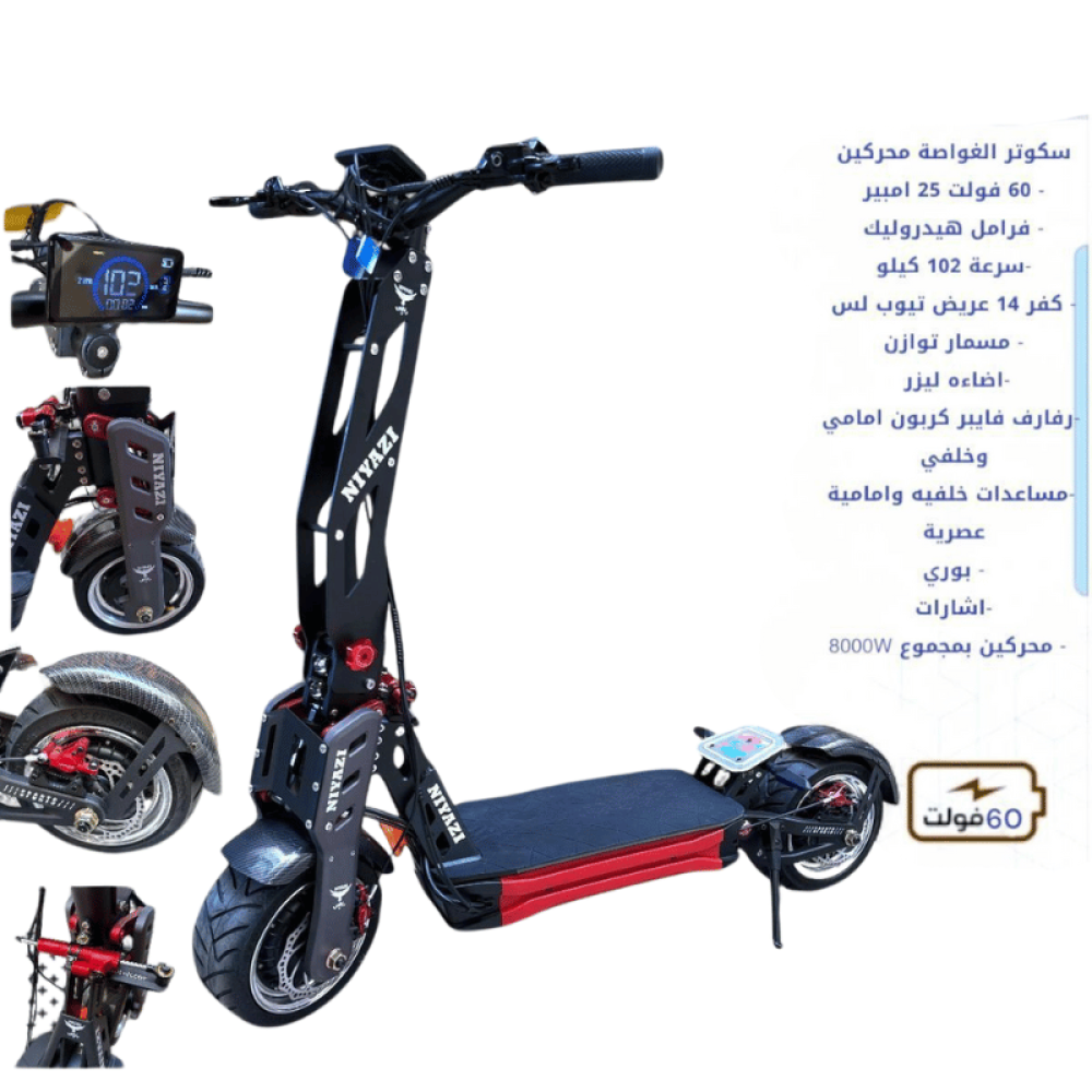 اجعل تنقلك أكثر قوة وسرعة مع سكوتر الغواصة ذو المحركين! مزود بمحركين قويين بقدرة 8000 واط، يوفر لك هذا السكوتر سرعة تصل إلى 102 كم/ساعة، مما يجعله الخيار المثالي للرحلات السريعة والأداء العالي. تم تصميمه بكفرات 14 بوصة وحواف مع فرامل هيدروليك لرحلات آمنة وثابتة على مختلف الطرق.