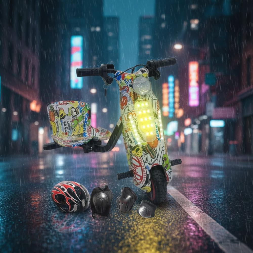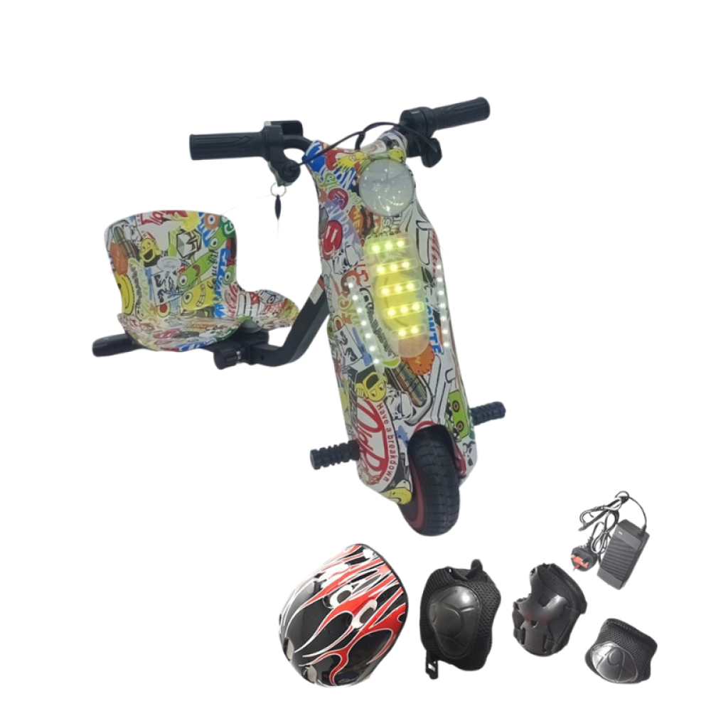 عيش المتعة والإثارة مع سكوتي المرح للدرفت الكهربائي! تصميم جرافيتي رهيب يجذب الأنظار وقيادة تحبس الأنفاس ، بطارية قوية 36 فولت تعطيك وقت لعب طويل، ومعاه شاشة بلوتوث وطاقم أمان كامل عشان تطمن على صغيرك . السكوتر فيه إضاءات أرضية وأمامية، ويفتح بمفتاح، يعني متعة وأمان في نفس الوقت .