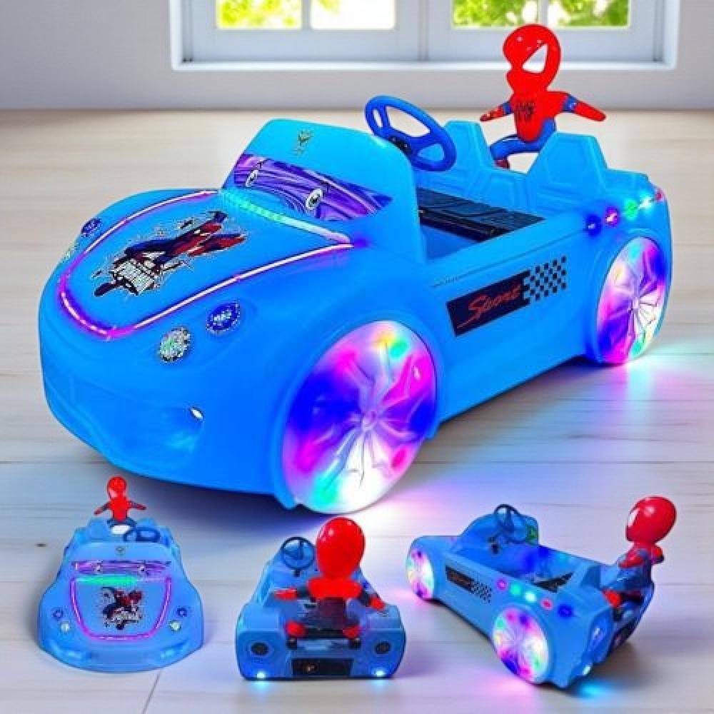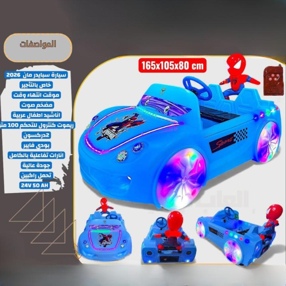 • سيارة كهربائية للأطفال بتصميم مميز على شكل سيارة سباق مع تمثال لشخصية سبايدرمان.