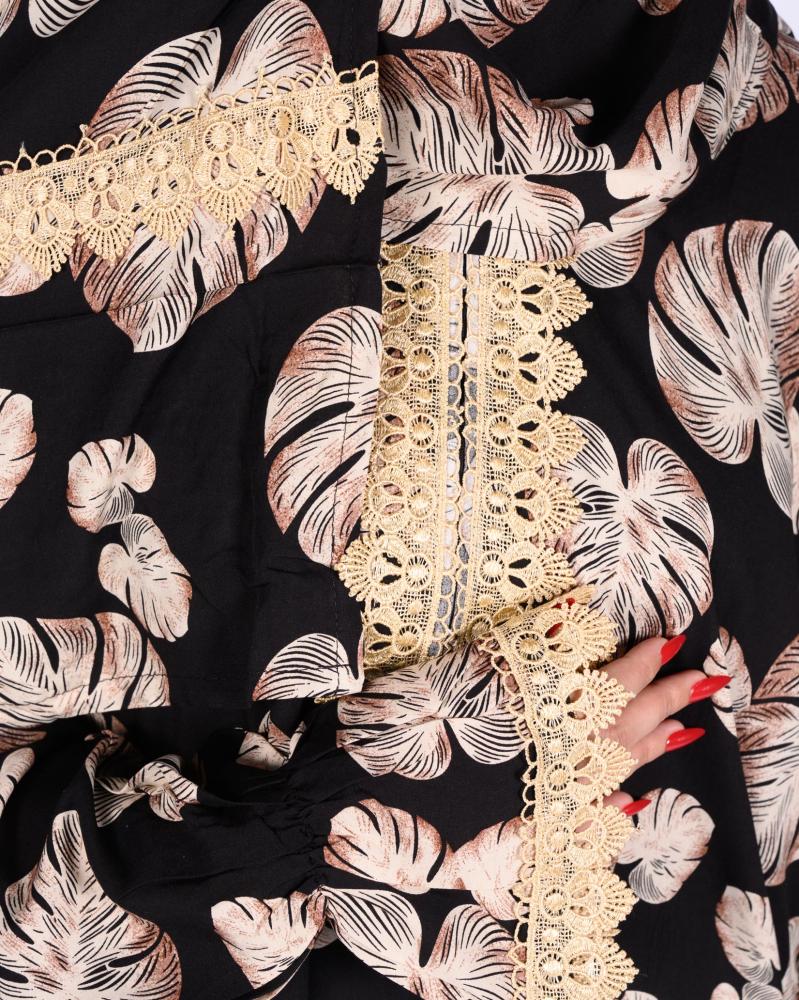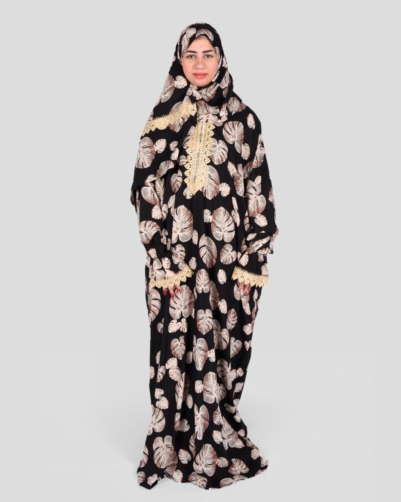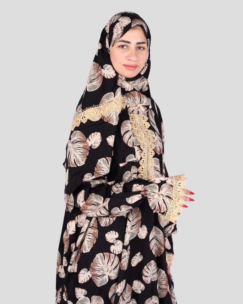 تألقي بلمسة من الأناقة والسكينة مع طقم الصلاة المصمم خصيصًا ليمنحكِ الراحة والجمال في أوقاتك الروحانية. يجمع هذا الطقم بين التصميم العملي واللمسة الجمالية، حيث يبرز بفضل تفاصيل نقوشه التي تضفي عليه فخامة لا مثيل لها. يأتي الطقم باللون الأسود الأساسي، مزين بنقوش كبيرة لأوراق الشجر باللون البني الفاتح. هذه الأوراق بتصميمها الواضح والجميل تخلق لوحة فنية فريدة تعكس ذوقك الرفيع. يضيف الدانتيل الفاخر باللون الذهبي الباهت لمسة من الرقة والأنوثة، حيث يمتد على أطراف غطاء الرأس، والأكمام، ومنطقة الصدر. هذا الدانتيل يكمل تصميم النقوش النباتية بشكل متناغم، ليضفي لمسة من الأناقة دون مبالغة. الطقم مصنوع من خامة ناعمة وخفيفة، توفر الراحة والتهوية أثناء الصلاة، مما يجعله مثاليًا للاستخدام في جميع الفصول. تصميمه الواسع يوفر لكِ حرية الحركة الكاملة، بينما القماش المريح يجعلكِ تشعرين بالراحة في كل خطوة. طقم مونستيرا هو الخيار الأمثل للمرأة التي تبحث عن الجودة والتصميم الراقي لأداء صلاتها في راحة تامة.