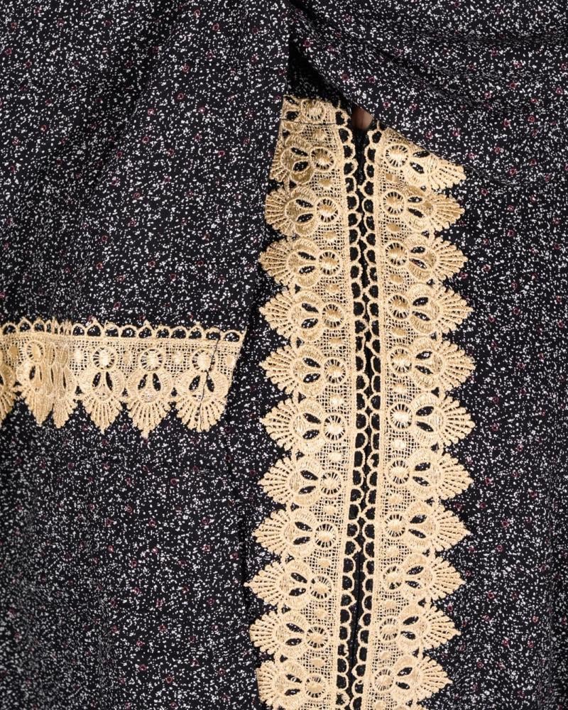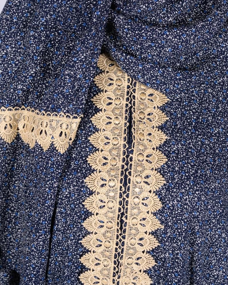 يتميز هذا الطقم بتصميم عملي ومريح. الشرشف وغطاء الرأس يأتي بالوان مختلفة تناسب مختلف الاذواق، مزين بنقوش زهور صغيرة يضيف الدانتيل الذهبي الفاتح لمسة من الأناقة على أطراف غطاء الرأس، والأكمام، والرقبة.