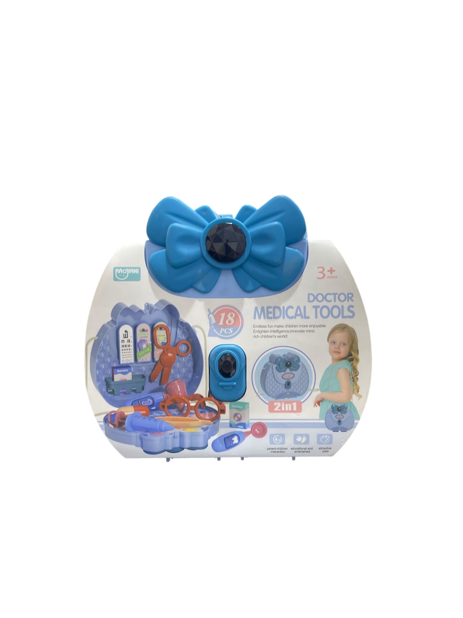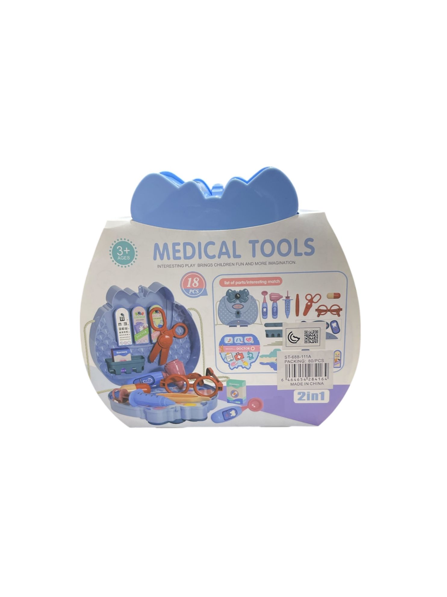 مخصصة للأطفال بعمر 3 سنوات فما فوق. تحتوي المجموعة على 18 قطعة، وتُعلن بأنها ". تظهر العبوة محتويات المجموعة التي تشمل أدوات طبية بلاستيكية متنوعة مثل مقص، نظارات، ميزان حرارة، وغيرها، بالإضافة إلى صندوق تخزين بلاستيكي أزرق.
