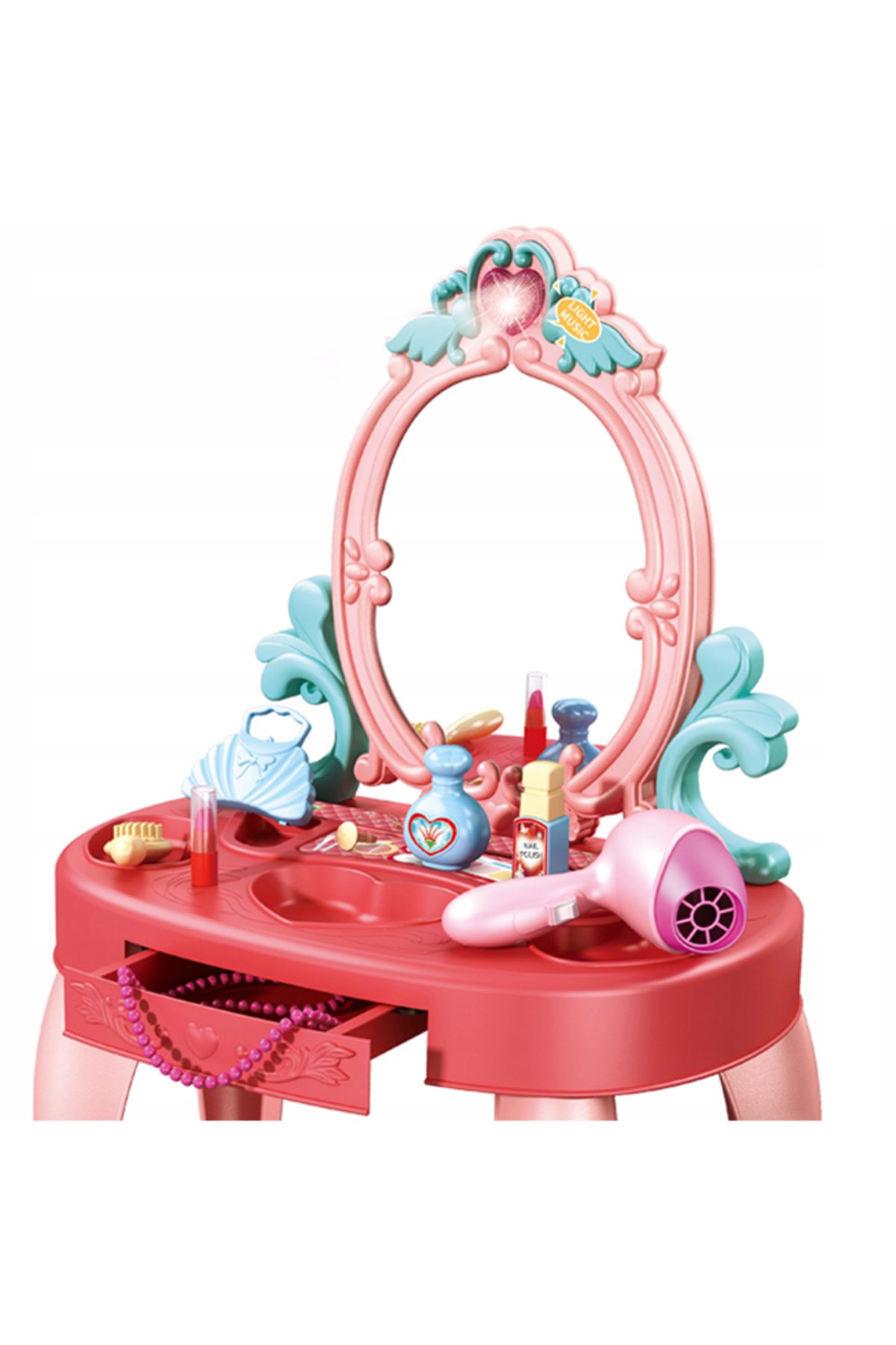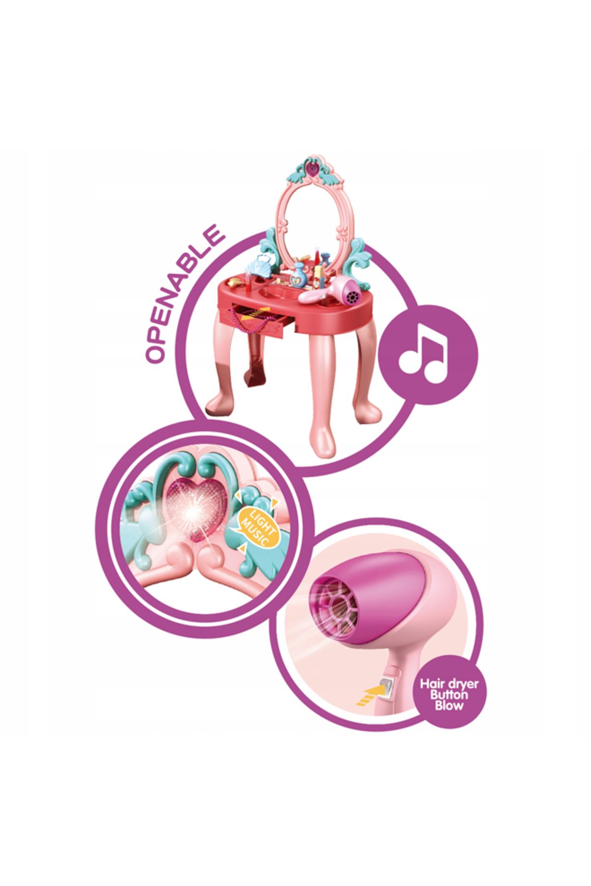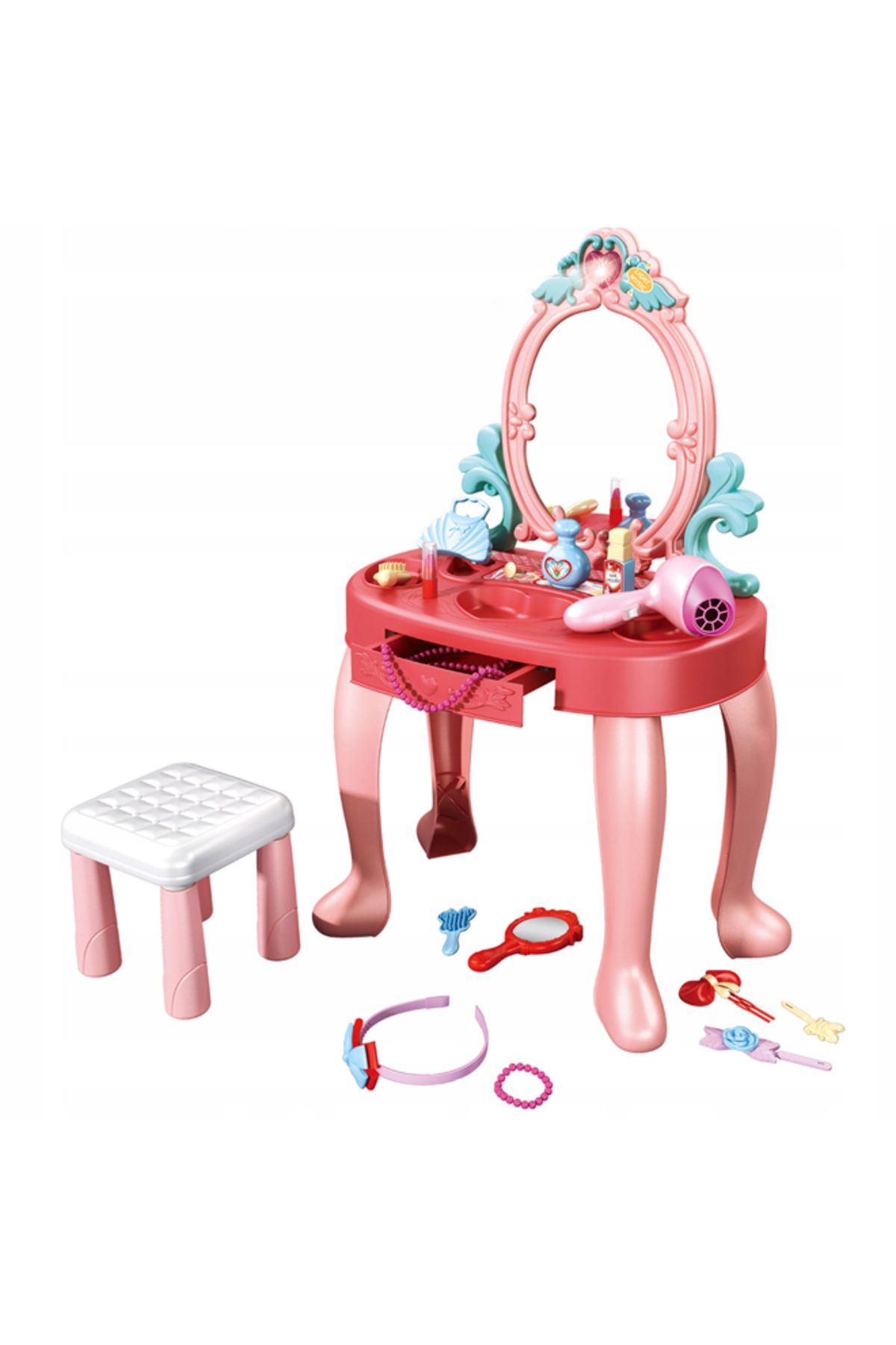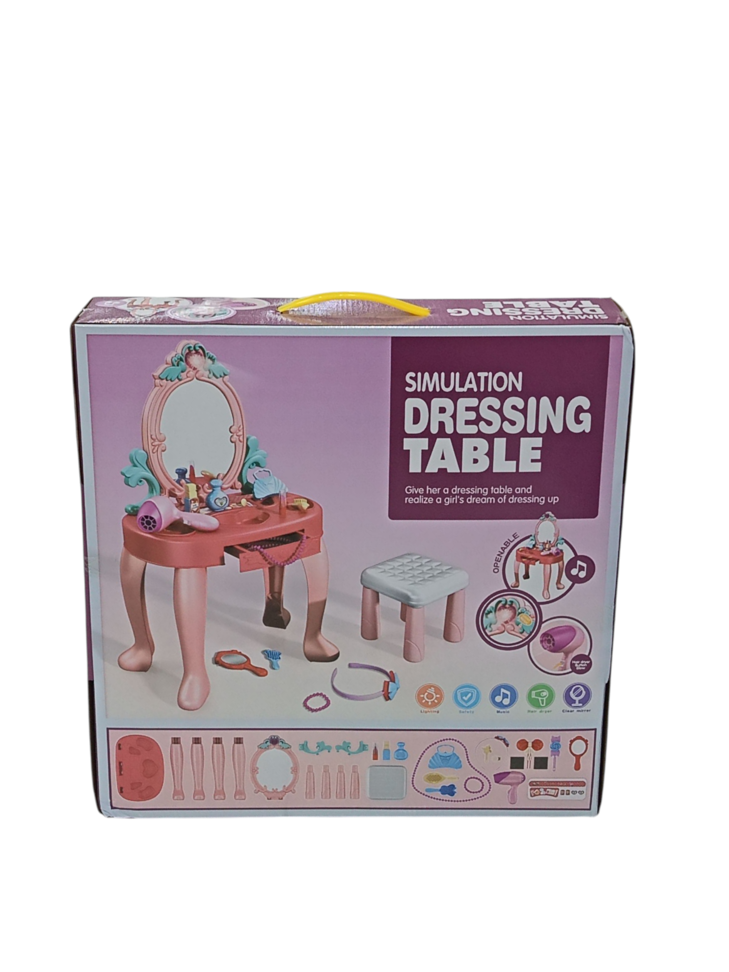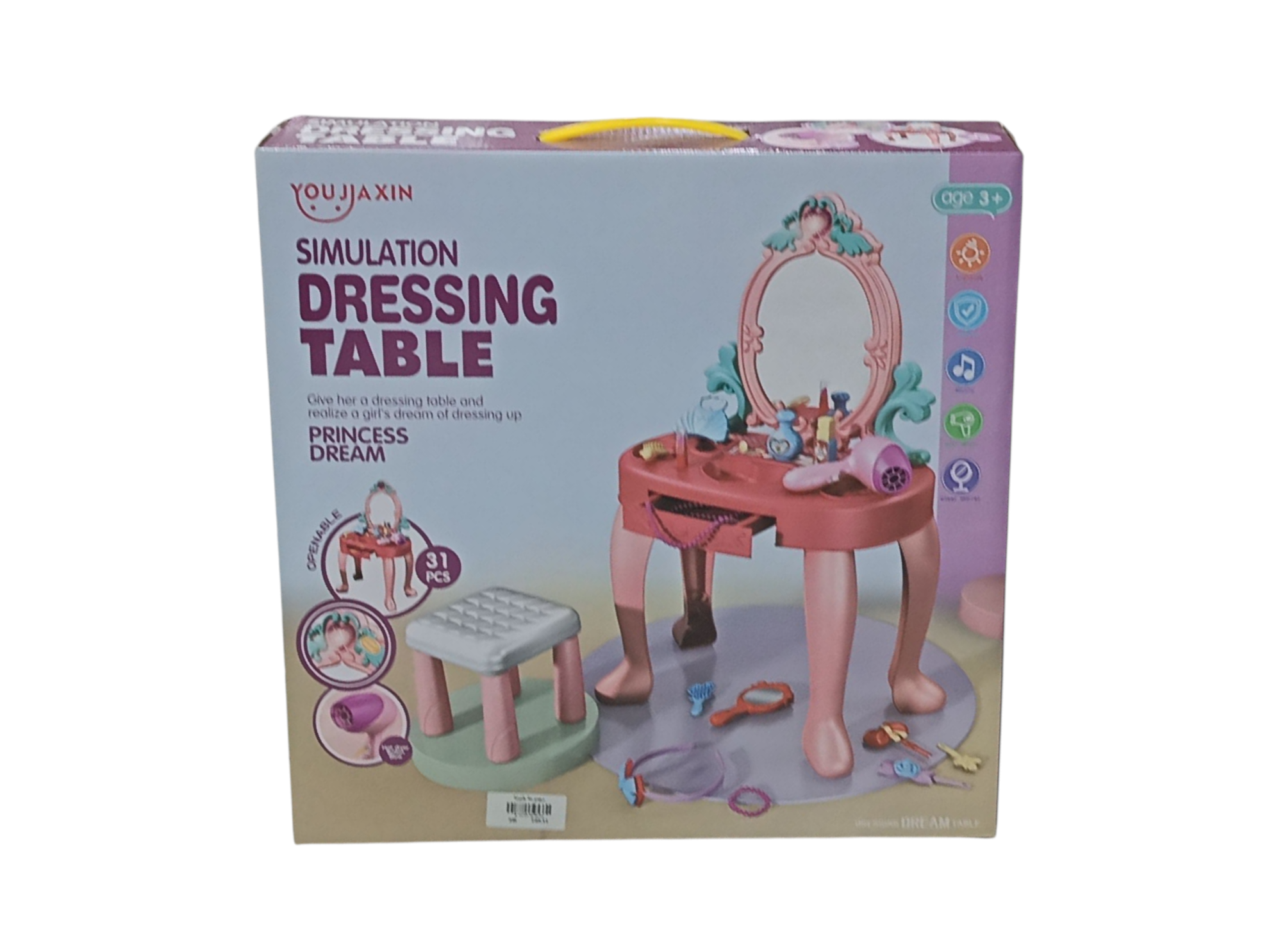 طاولة تزيين الأميرة المحاكية  هي لعبة لعب أدوار مصممة تتكون من 31 قطعة مع الكرسي  للأطفال بعمر 3 سنوات فما فوق