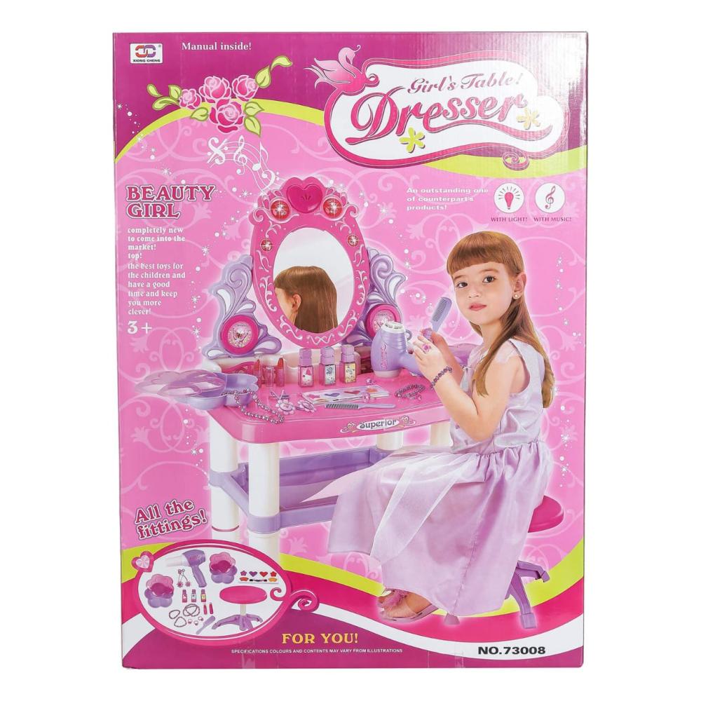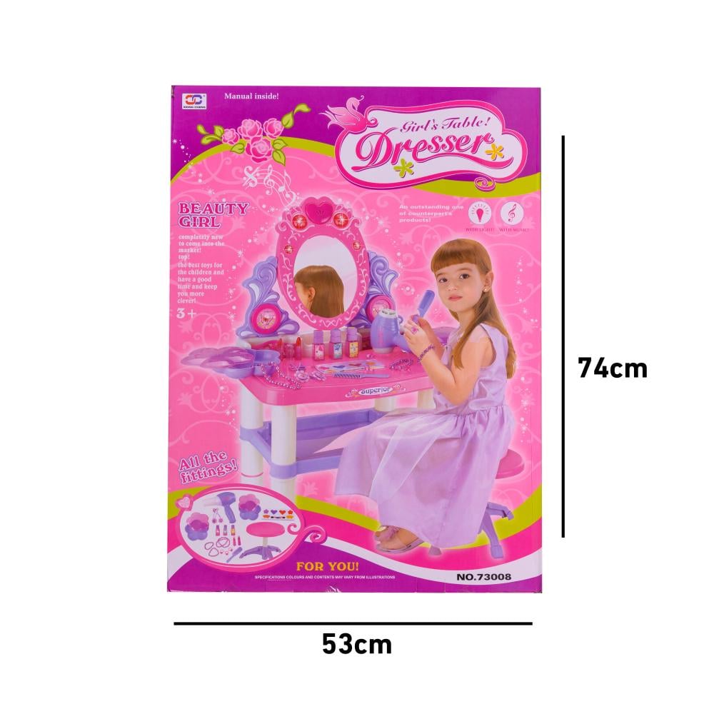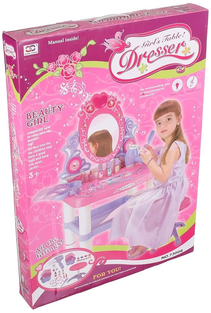 طاولة زينة ألعاب للأطفال على شكل أميرة، وهي مجموعة لعب تظاهري تعمل بالبطارية مع مرآة تجميل وملحقاته