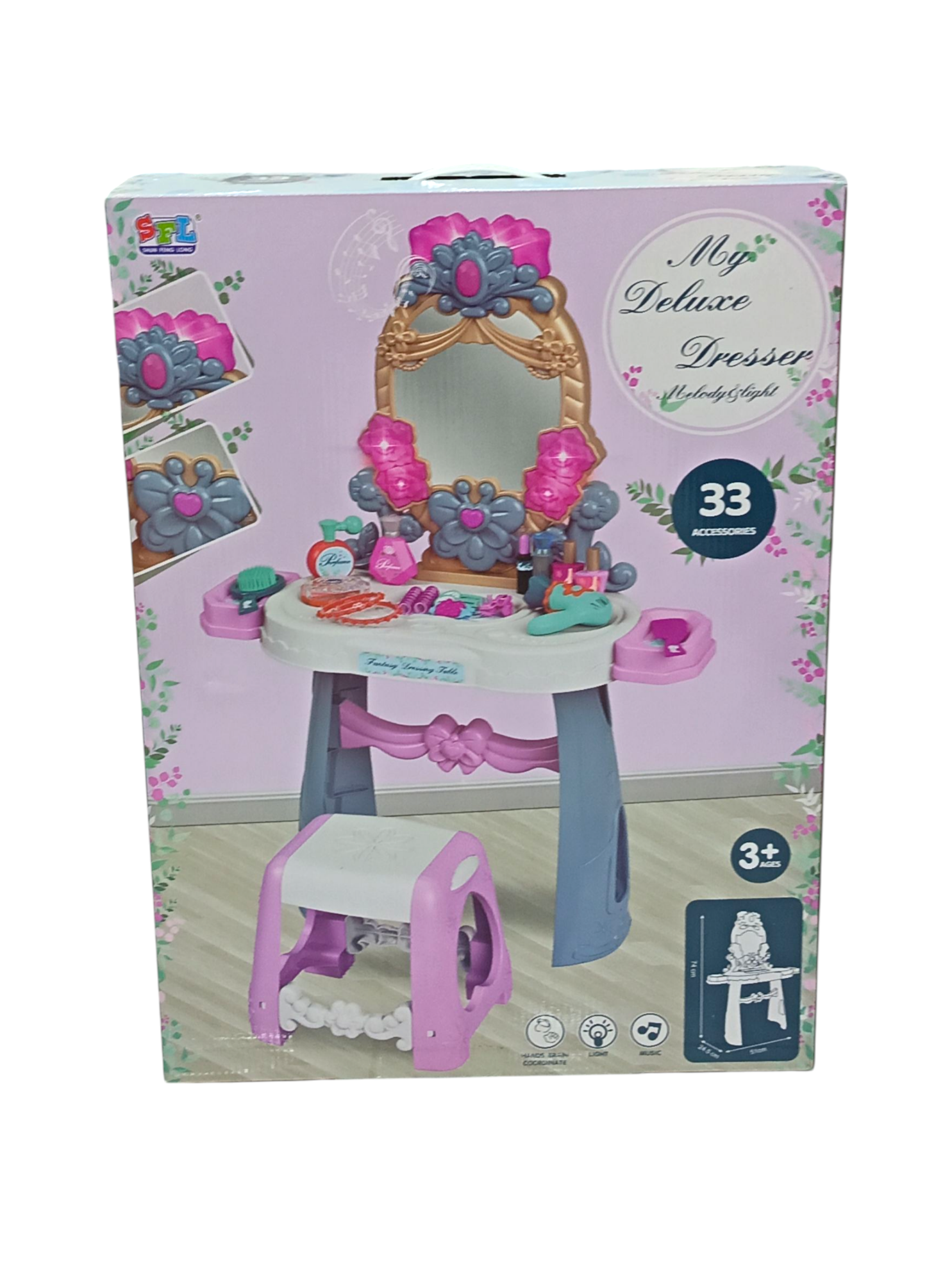 طاولة زينة فاخرة للأطفال تحمل اسم "My Deluxe Dresser". تتضمن 33 قطعة إكسسوار. مناسبة للأطفال بعمر 3 سنوات فما فوق. تحتوي على مرآة وإكسسوارات تجميلية. يبدو أنها مصممة لتوفير تجربة لعب ممتعة للأطفال