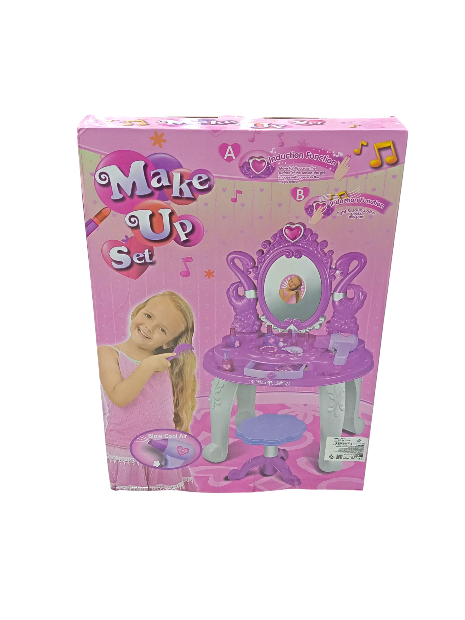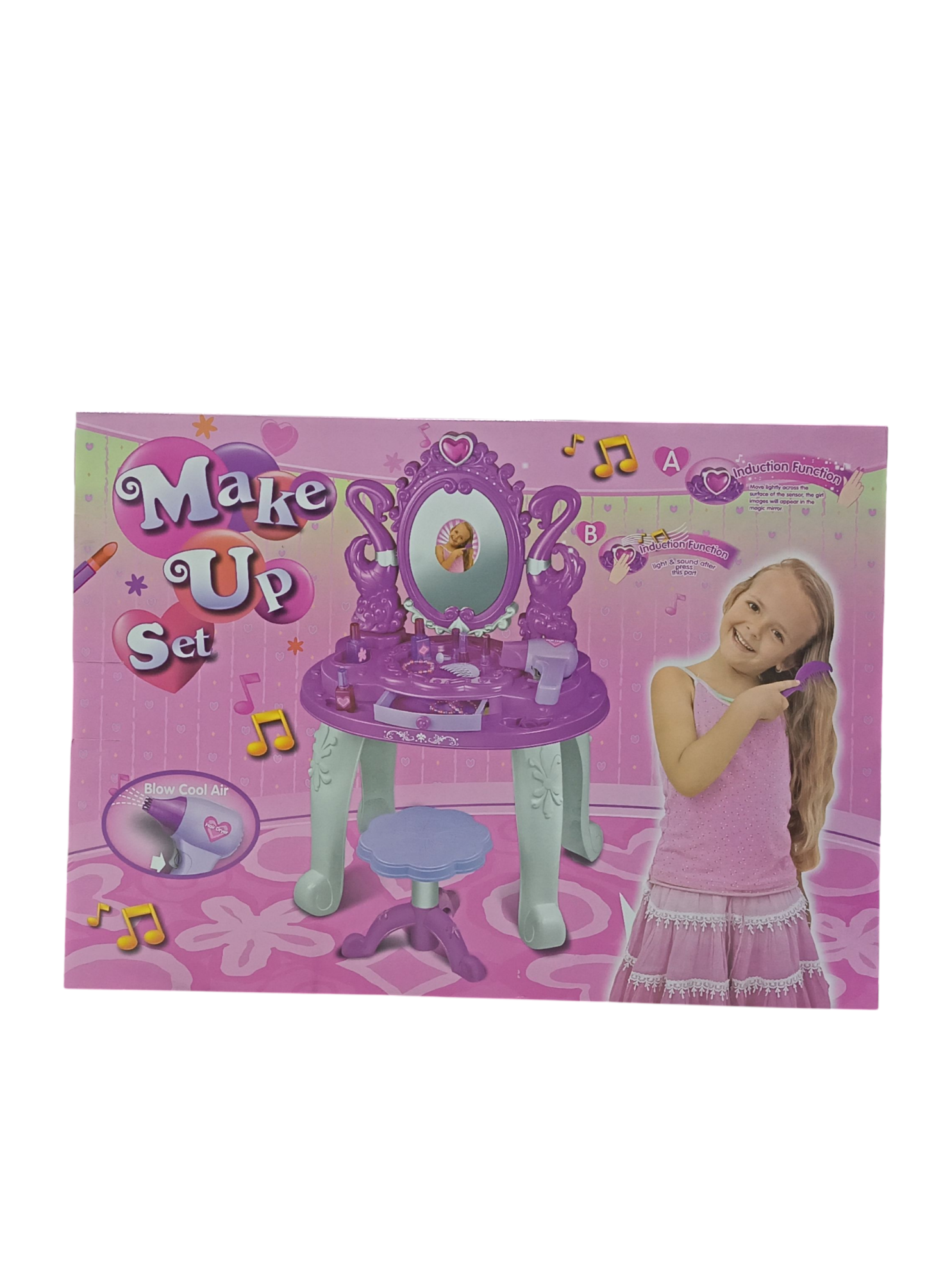 يتضمن طاولة زينة صغيرة بمرآة، وكرسي صغير، وإكسسوارات مكياج للعب مثل أحمر الشفاه وفرشاة شعر.