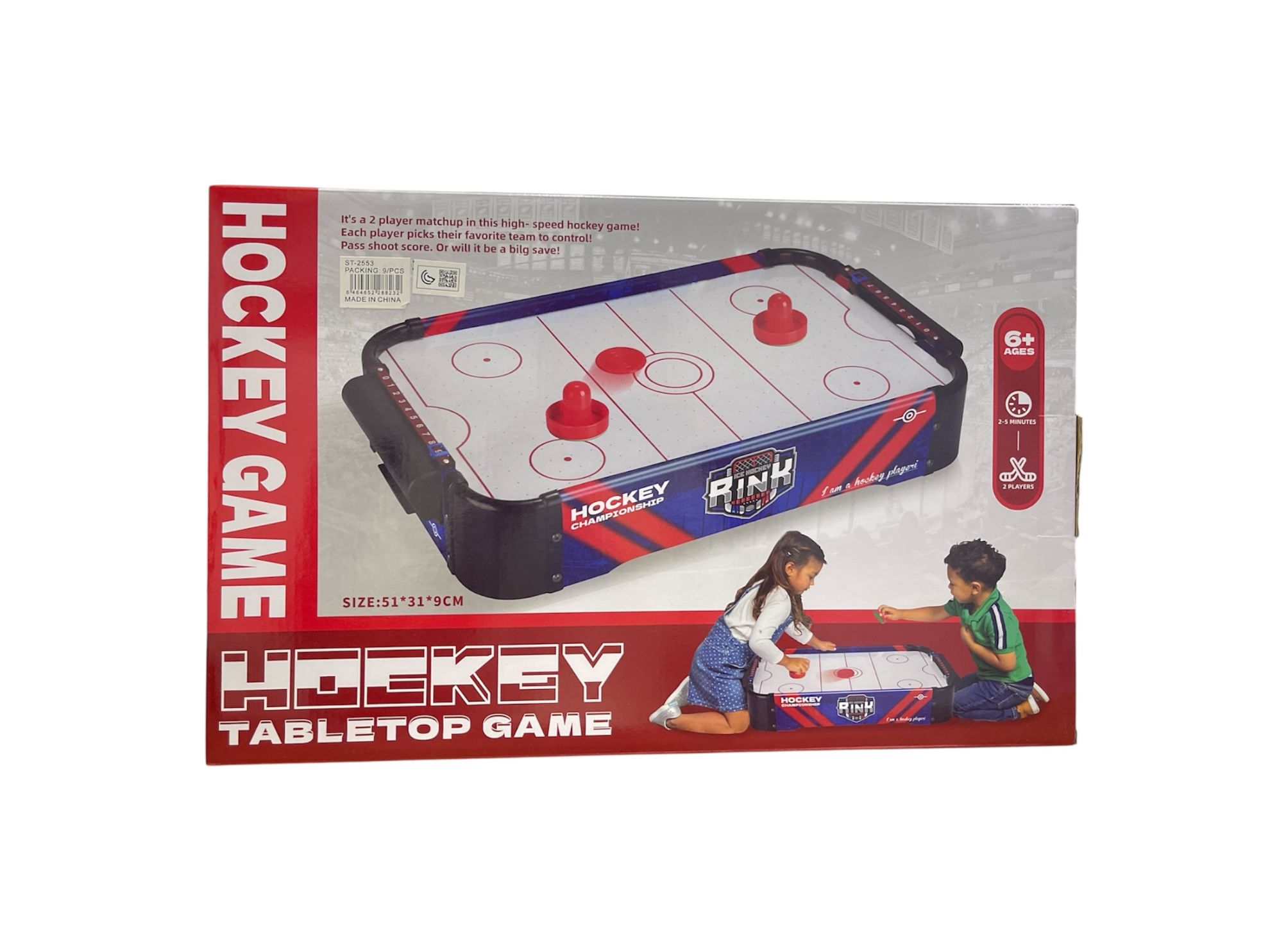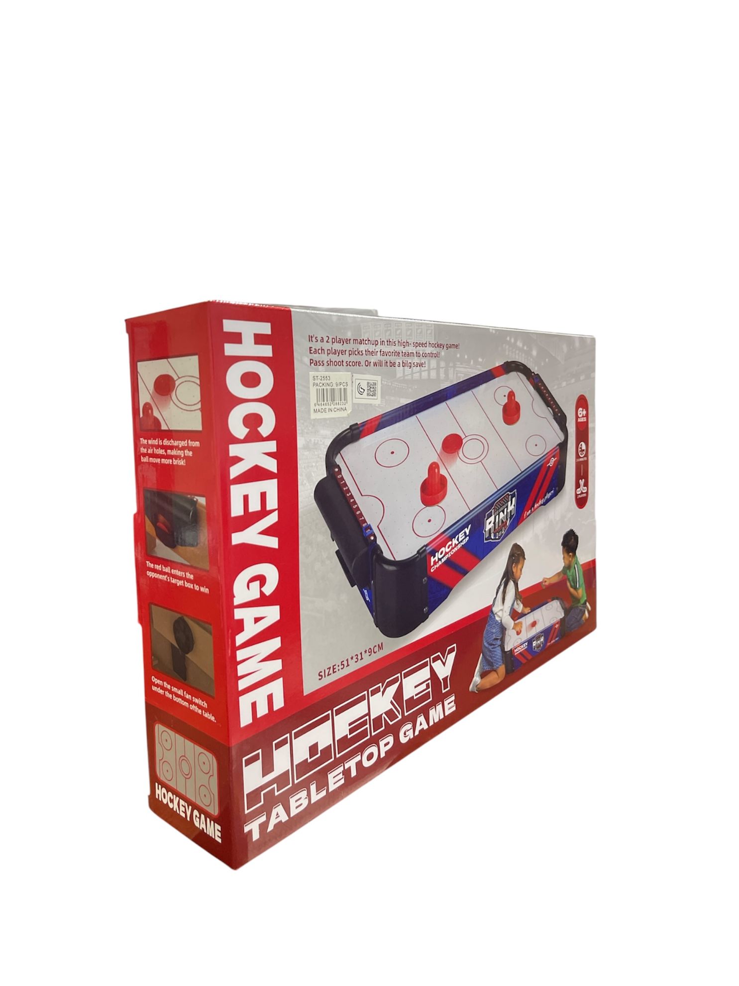 المكونات: تتكون من طاولة هوكي مصغرة، أقراص (باكس)، ومضارب يدوية (مطارق)