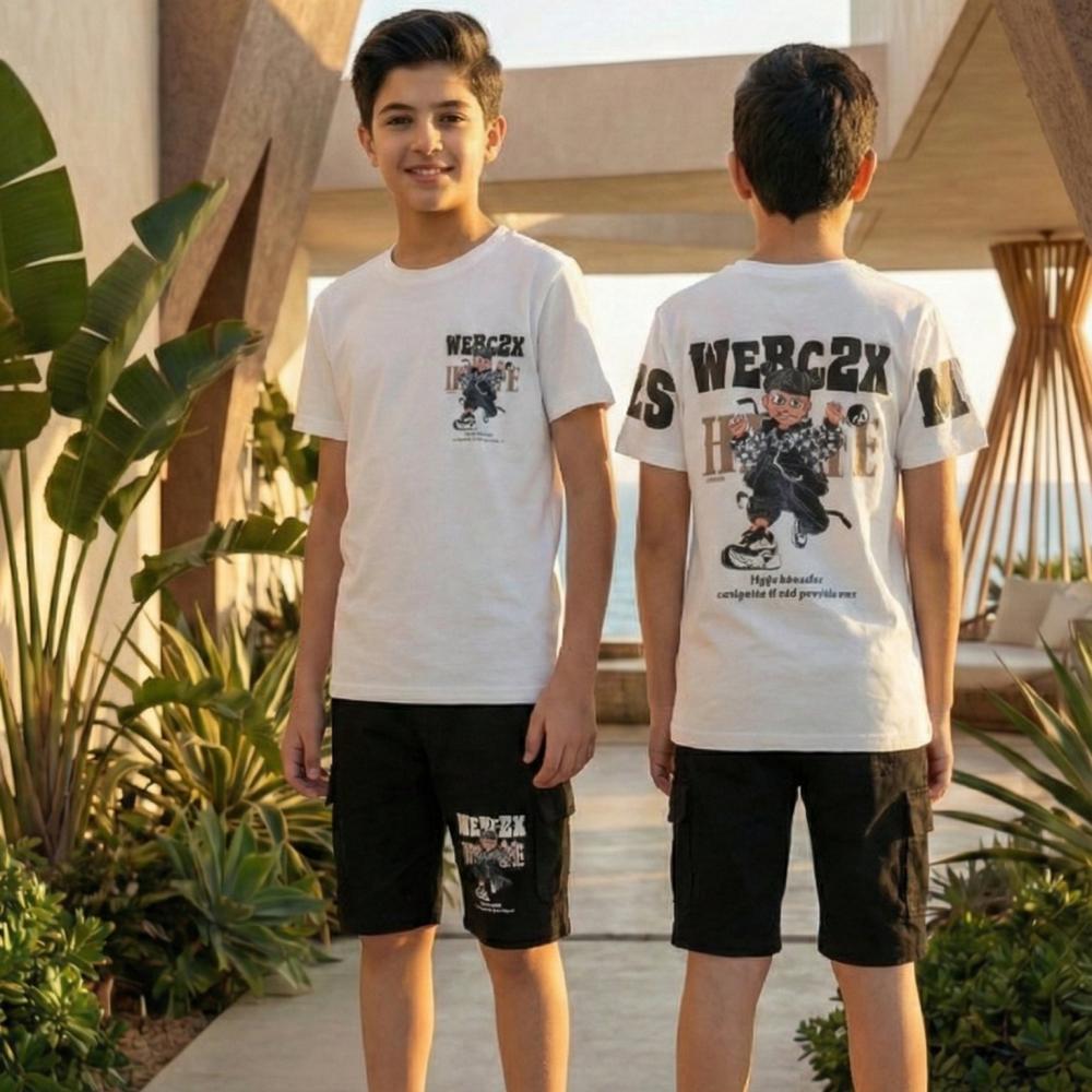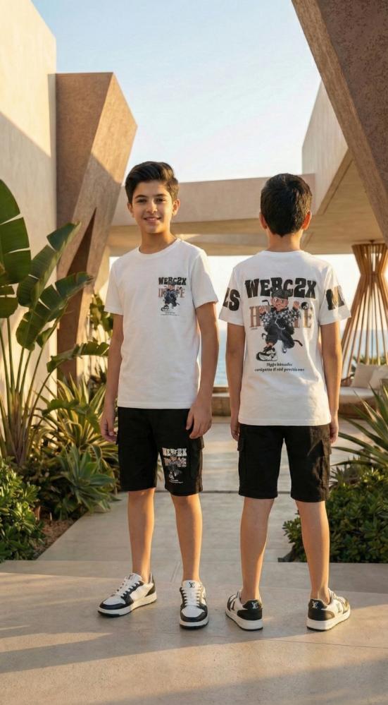 تألق بمظهر عصري يجمع بين الراحة والأناقة مع هذا الطقم الصيفي المتميز. صُمم هذا الطقم ليكون الخيار الأمثل للأطفال والناشئين الذين يبحثون عن إطلالة ستريت وير (Streetwear) مواكبة للموضة.