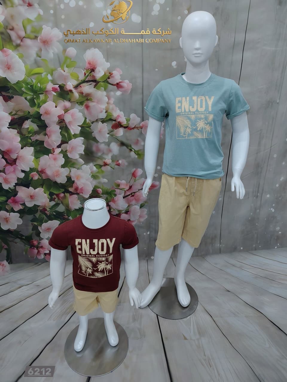 طقم أولادي صيفي مكوّن من تيشيرت بطباعة ENJOY مع نخيل ولمسة ألوان منعشة، وشورت بيج عملي. خامة خفيفة ومريحة تمنح إطلالة مرحة ومناسبة للّعب والطلعات اليومية.