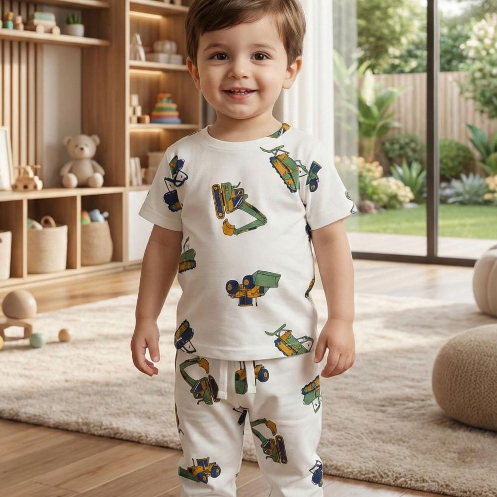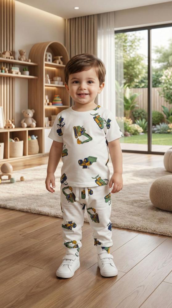 صُمم هذا الطقم خصيصاً للأطفال محبي الاستكشاف والمغامرة. يتميز بلون أبيض ناصع مزين بطبعات ملونة ومبهجة لآلات البناء (الجرافات والرافعة)، مما يمنح طفلك إطلالة مليئة بالطاقة والمرح. يتكون الطقم من تيشيرت بأكمام قصيرة وبنطلون مريح بخصر مطاطي، مما يجعله مثالياً للحركة المستمرة واللعب اليومي.