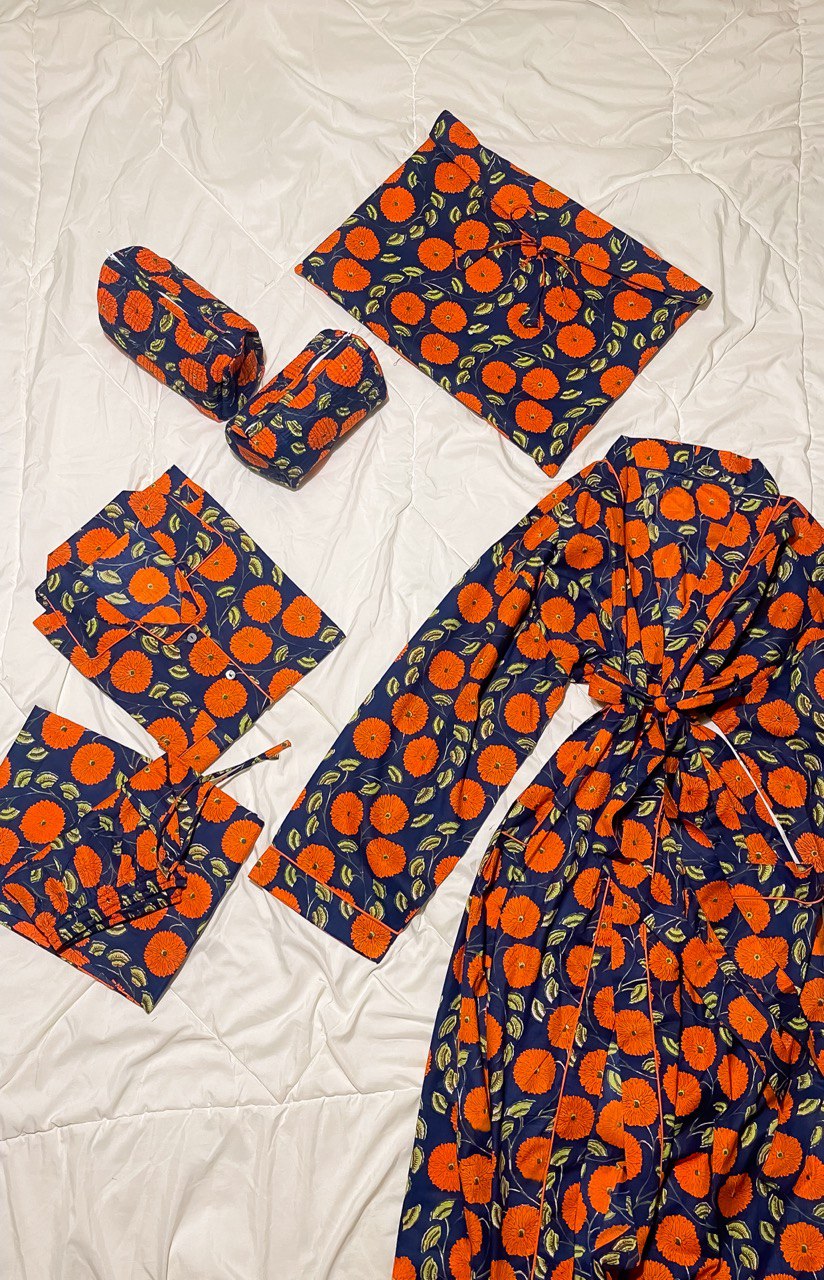 طقم يتكون من 1 روب فضفاض 1 بجامة فري سايز 2 حقيبة مكياج متوسطة الحجم 1 حقيبة باوتش قطني كبيرة القماش قطن هندي