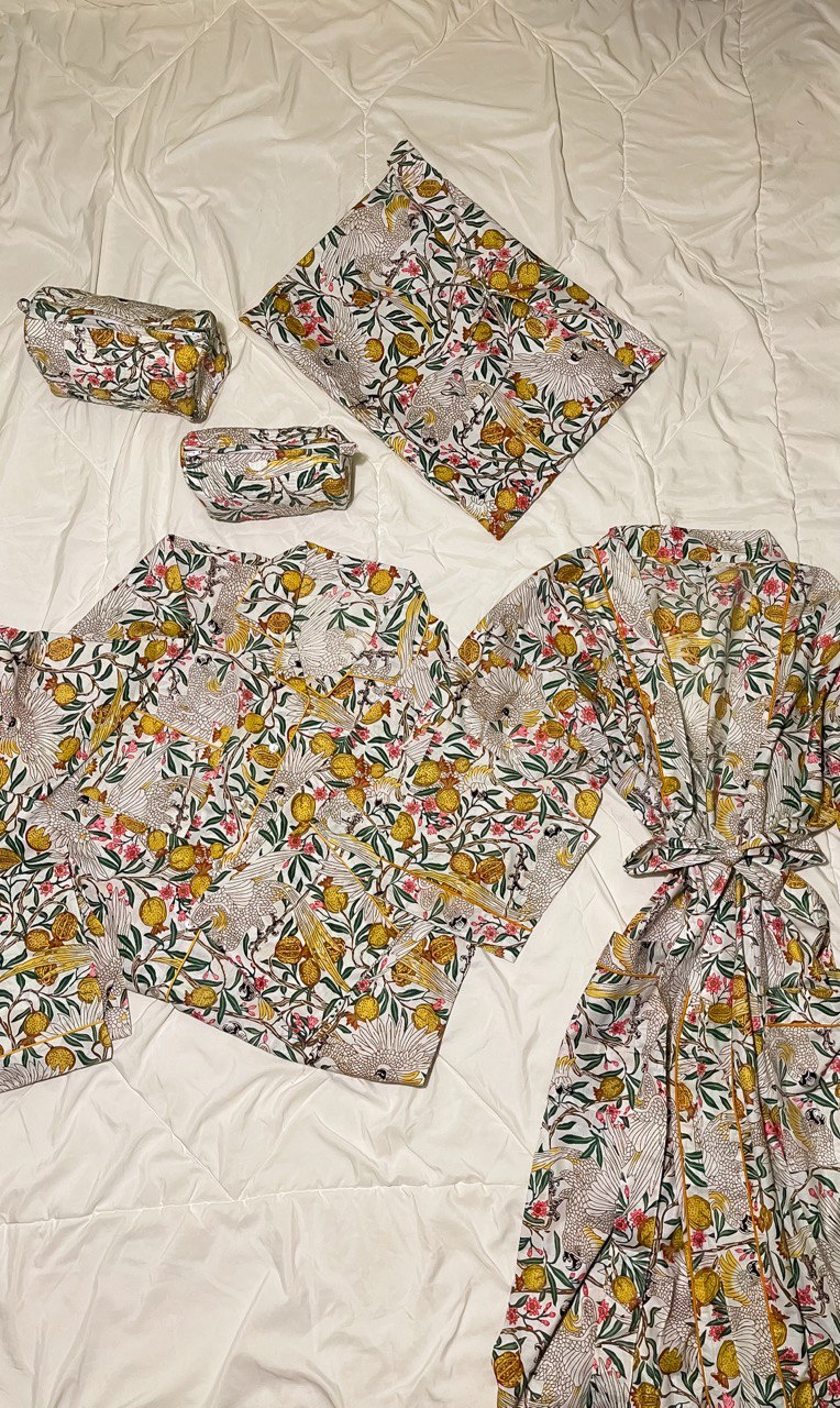 طقم يتكون من 1 روب فضفاض 1 بجامة فري سايز 2 حقيبة مكياج متوسطة الحجم 1 حقيبة باوتش قطني كبيرة القماش قطن هندي