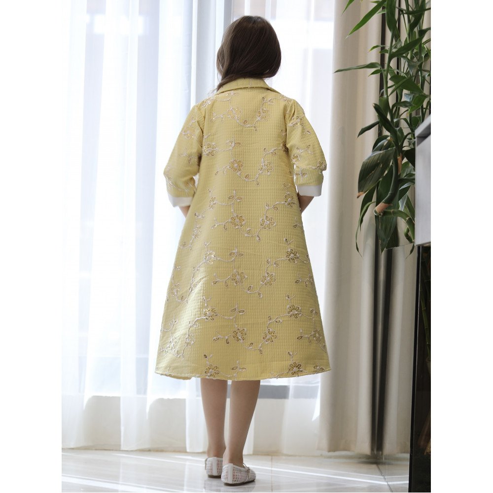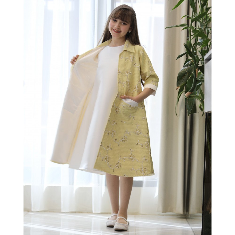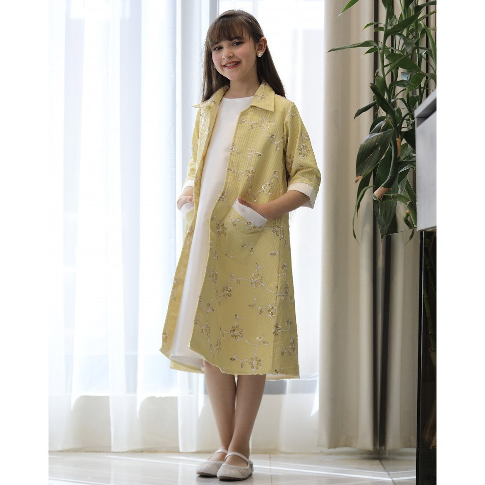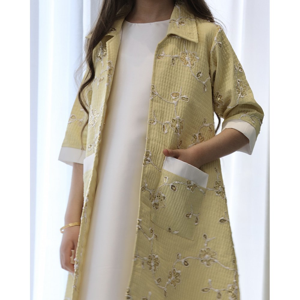 أناقة الشمس.. حين يلتقي رقي المعطف بنقاء الفستانفي "توتي كيدز"، نعيد تعريف الأناقة العملية، وهذا الطقم هو الخيار الأمثل للأميرة التي تحب الحضور الرسمي بلمسة من الحيوية. نقدم لكِ الموديل 1193، قطعة فنية متكاملة تجمع بين بساطة الفستان الأبيض الداخلي وفخامة الجاكيت الأصفر المشجر بنقوش رقيقة. صُمم هذا الطقم ليمنح أميرتك إطلالة "كوتور" راقية، حيث تبرز الياقة الرسمية والجيوب الخارجية المحددة باللون الأبيض كعلامة على الذوق الرفيع والاهتمام بأدق التفاصيل. إنه ليس مجرد طقم ملابس، بل هو إعلان عن أناقة تليق بأجمل لحظاتها. لماذا هذا الطقم هو الخيار الأكمل لمناسباتك القادمة؟لأنه يجمع بين التصميم المتكامل والعملية في قطعة واحدة:تصميم ملكي من قطعتين: يتكون الطقم من فستان أساسي أبيض ناعم يعلوه جاكيت (معطف متوسط الطول) مشجر، مما يوفر إطلالة محتشمة ومرتبة جداً تعطي انطباعاً بالفخامة.جاكيت مشجر بجيوب خارجية: يتميز الجاكيت بقماش فاخر بنقشات زهور وأغصان متداخلة مع اللون الأصفر المشرق، مع إضافة جيبين خارجيين محددين باللون الأبيض، مما يضفي لمسة عصرية وعملية فريدة.تفاصيل بيضاء متباينة: تزدان أطراف الأكمام والجيوب والياقة بلمسات من اللون الأبيض الناصع، مما يكسر حدة النقشة ويمنح التصميم توازناً بصرياً مذهلاً يبرز جمال وجه أميرتك.ياقة رسمية أنيقة: الجاكيت مصمم بياقة قميص كلاسيكية، تمنح الطفلة طابعاً أرستقراطياً مناسباً للأعياد، حفلات التخرج، والزيارات الرسمية.قصة مريحة وعملية: يجمع الطقم بين الشكل الفخم والراحة التامة، مما يتيح لأميرتك الحركة واللعب بكل ثقة وأناقة طوال وقت الاحتفال.جودة تليق بلحظات لا تُنسى نحن نؤمن أن الجمال يبدأ من جودة التنفيذ. هذا الطقم مصنوع بحرفية عالية جداً، من أقمشة باردة تسمح للبشرة بالتنفس، مع خياطة متقنة تضمن بقاء النقوش والجيوب محافظة على شكلها الفخم ورونقها مهما تعددت مرات الارتداء.امنحيها إطلالة تشرق بـسحر الأصفر والتميز! اجعلي من إطلالة أميرتك في المناسبة القادمة ذكرى لا تُمحى بقطعة تجمع بين الفن والترف العملي.✨ اطلبيه الآن (موديل 1193) ودعي أميرتك الصغيرة تتألق بإشراقة لا تقاوم! ✨ شاركينا إطلالتها الساحرة!يسعدنا دائماً رؤية أميراتكم يتألقن بتصاميمنا التي تعكس ذوقكم الرفيع. ندعوكِ لمشاركة صورها وتقييمك للمنتج، فرأيك هو مصدر إلهامنا الدائم لنقدم الأفضل دائماً.خدماتنا: نقدم لكِ تجربة تسوق ممتعة مع شحن سريع وموثوق لجميع المناطق، وسياسة استبدال واسترجاع مرنة لضمان رضاكِ الكامل.