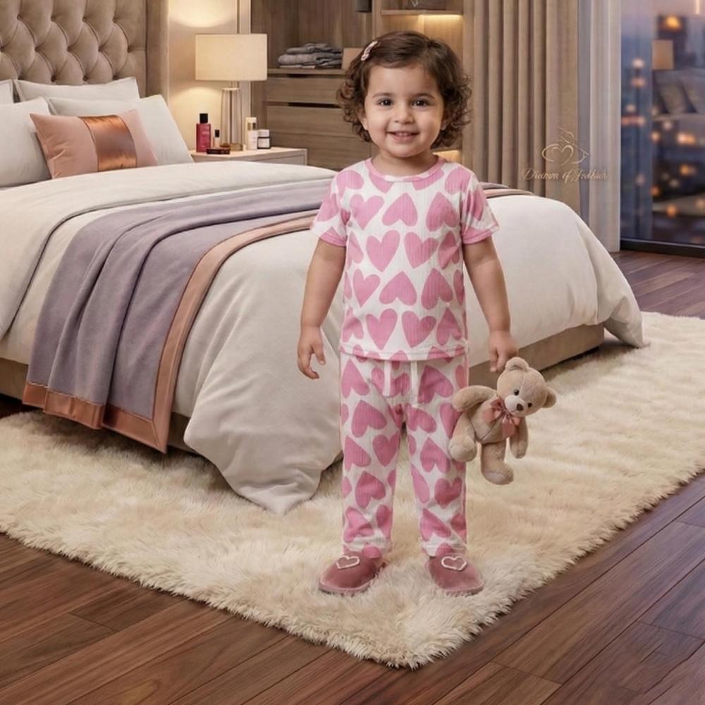 اجعلي وقت النوم أكثر مرحاً ونعومة مع طقم بيجامة قلوب الحب. صُمم هذا الطقم ليمنح طفلتك الراحة الفائقة مع لمسة من الأناقة واللطافة التي تحبها كل فتاة.