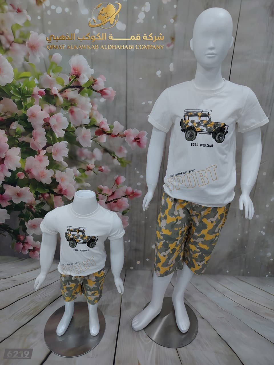 طقم أولادي مكوّن من تيشيرت أبيض بطباعة سيارة أوف رود وشورت تمويه أصفر رمادي. تصميم عملي ومريح يمنح إطلالة حيوية مناسبة للّعب والطلعات اليومية.
