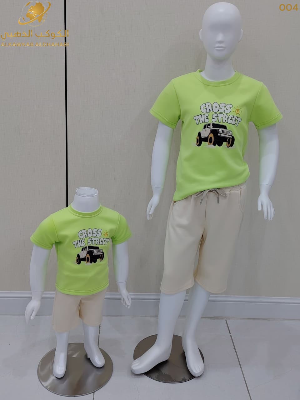 طقم أطفال صيفي مكوّن من تيشيرت أخضر فاتح بطبعة سيارة جيب لطيفة مع عبارة CROSS THE STREET، وشورت بيج بسيط لإطلالة مريحة وعملية.