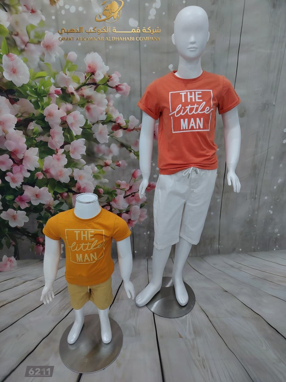 طقم أولادي صيفي مكوّن من تيشيرت مطبوع بشعار THE little MAN وشورت مريح بلون مشرق، تصميم عملي يمنح طفلك إطلالة عصرية ومنعشة في الأيام الحارة.