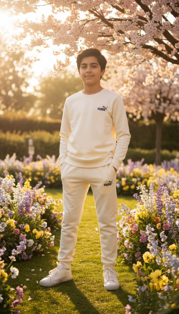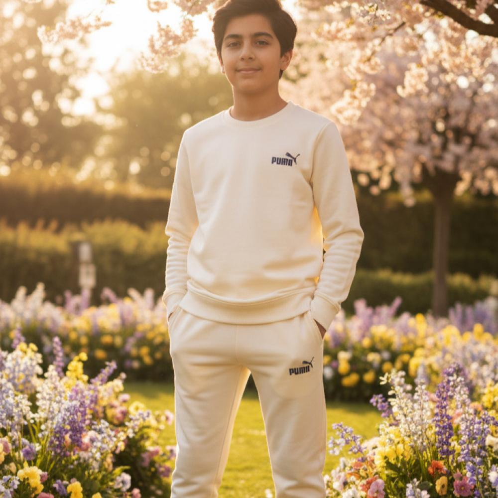 طقم رياضي سكري اللون يتكون من سويت شيرت وبنطال. السويت شيرت ذو رقبة مستديرة وأكمام طويلة، والبنطال بقصة مريحة. كلاهما يحمل شعارًا صغيرًا بلون داكن ومتباين. يتميز الطقم بمظهره الكاجوال والمريح، مما يجعله مناسبًا للارتداء اليومي أو للأنشطة الخفيفة في الهواء الطلق