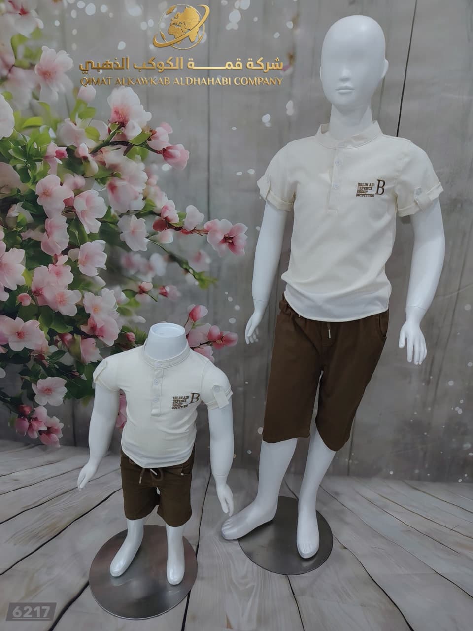 طقم أولادي مكوّن من قميص كريمي بياقة صغيرة وطباعة جانبية بسيطة، مع شورت بني عملي. تصميم مريح وخفيف يمنح إطلالة مرتبة تناسب الطلعات اليومية واللبس العملي.