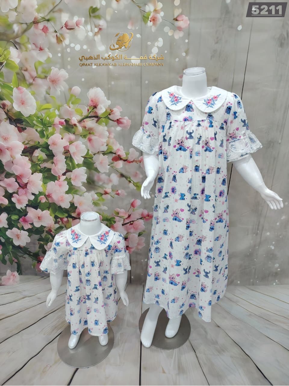طقم أم وبنت بتصميم ناعم بطبعات زهرية هادئة وياقة مطرّزة تضيف لمسة رقي. خامة مريحة وقَصّة أنثوية تمنح إطلالة متناسقة ولطيفة لكل مناسبة.
