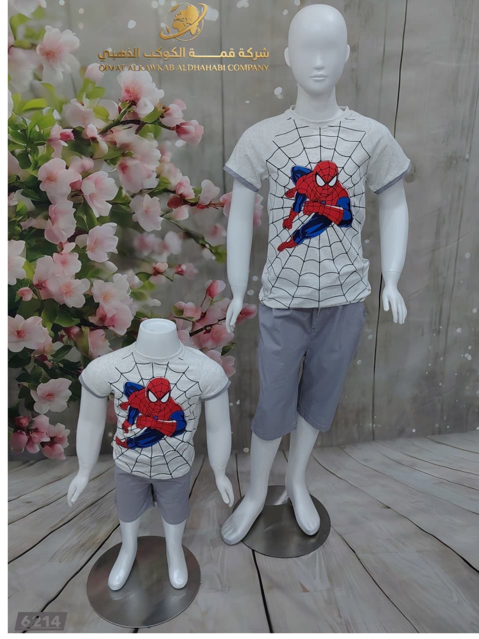 طقم أولادي مكوّن من تيشيرت رمادي بطباعة سبايدرمان مع خلفية شبكة مميزة، وشورت رمادي عملي. خامة مريحة وتصميم محبوب يمنح إطلالة مرحة لعشّاق الأبطال.