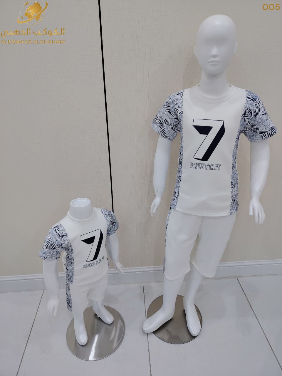 طقم أطفال صيفي أنيق يتكوّن من تيشيرت أبيض بنقشة جانبية ملوّنة ورقم 7 كبير مع عبارة SEVEN STARS، مع شورت أبيض بسيط لإطلالة مريحة وعصرية.