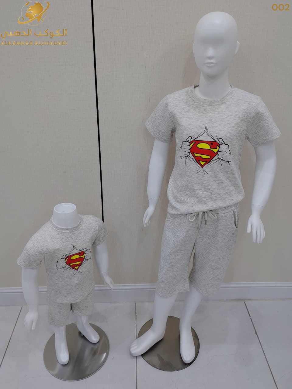 طقم أطفال رمادي بتصميم سوبرمان، يتكوّن من تيشيرت قصير الأكمام بطبعة شعار سوبرمان الممزق من المنتصف، مع شورت رمادي مريح لإطلالة كاجوال بطابع بطولي يحبّه الأطفال.