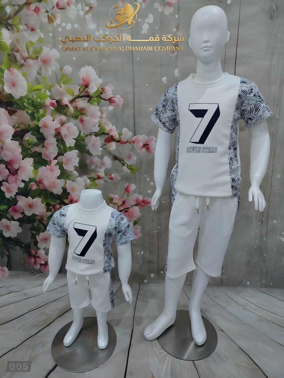 طقم أولادي مميز بقميص أبيض بطباعة رقم 7 وتفاصيل أوراق جانبية، مع شورت أبيض عملي. تصميم مريح وعصري يمنح إطلالة شبابية مناسبة للطلعات اليومية.