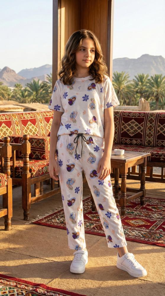استقبلي أوقات الاسترخاء واللعب بأناقة لا مثيل لها مع طقم البيجامة المريح هذا. مصمم خصيصاً للفتيات اللواتي يعشقن التميز والراحة في آن واحد.