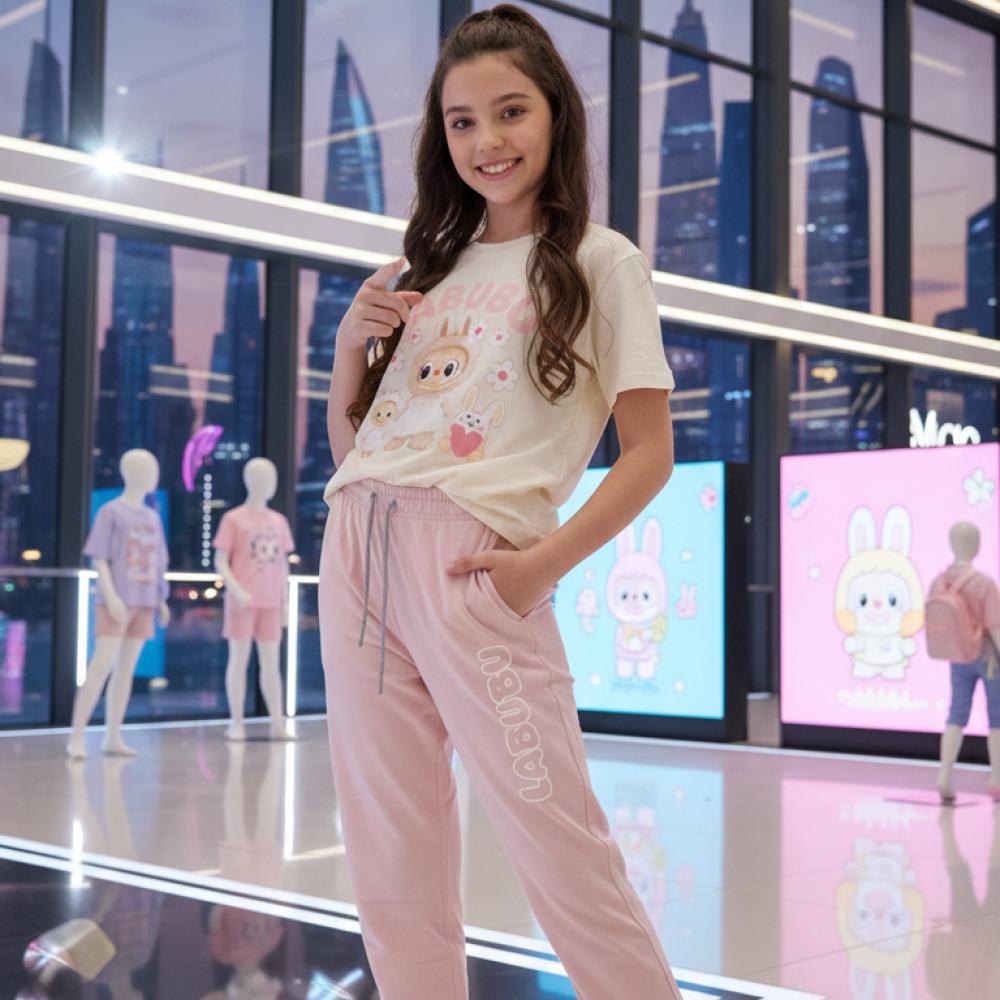 • القطعة السفلية: بنطال طويل بخصر مطاطي مزود برباط أسود للتحكم في المقاس، مع نهايات (كفات) عند الكاحل لإطلالة عصرية Jogger Style.