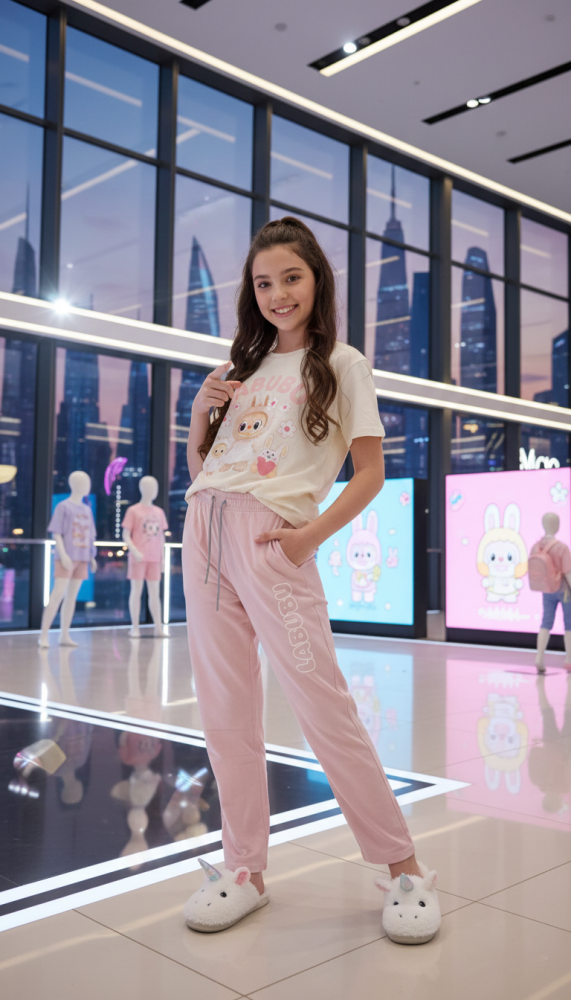 استقبلي أوقات الاسترخاء واللعب بأناقة لا مثيل لها مع طقم البيجامة المريح هذا. مصمم خصيصاً للفتيات اللواتي يعشقن التميز والراحة في آن واحد.